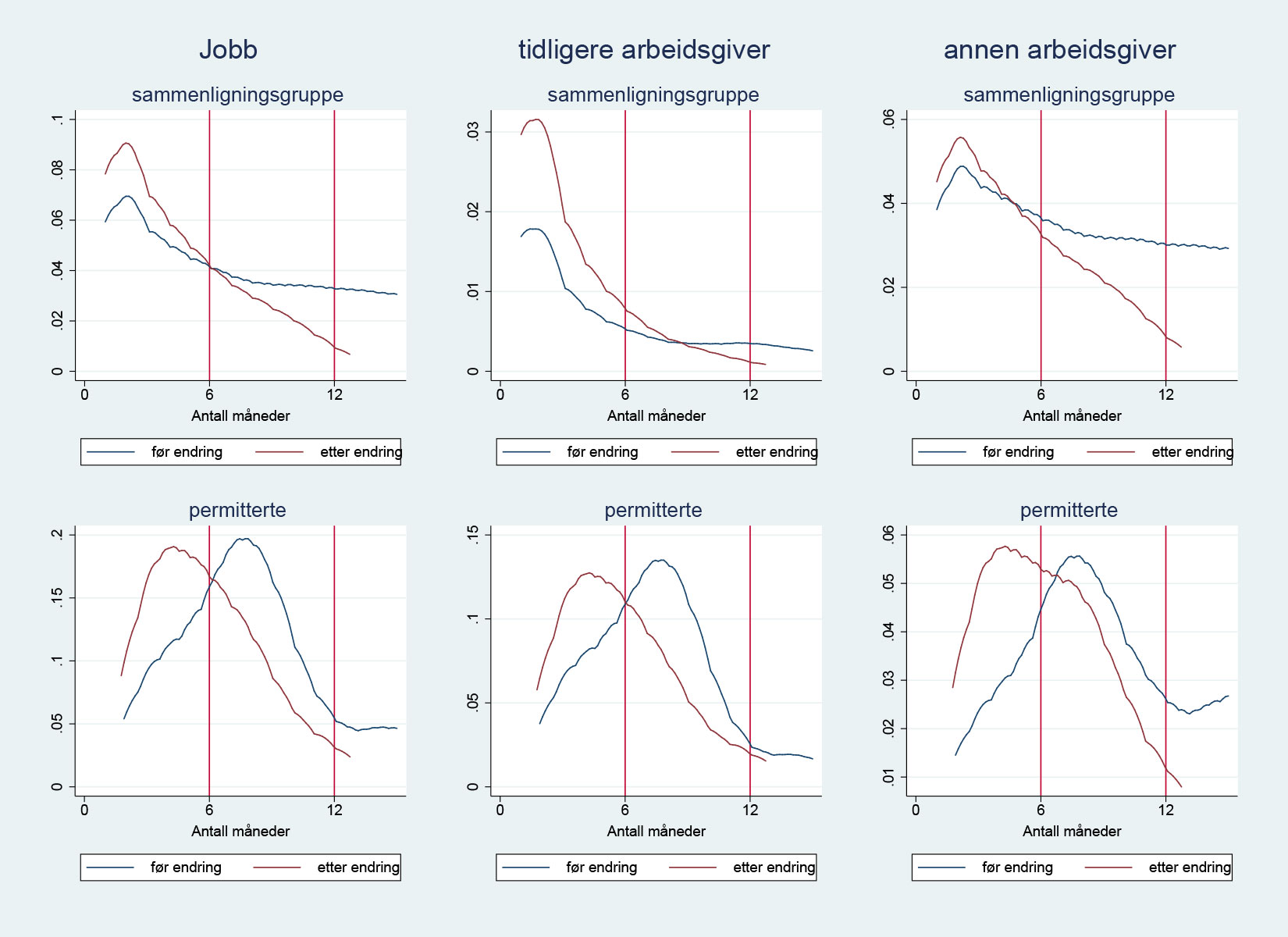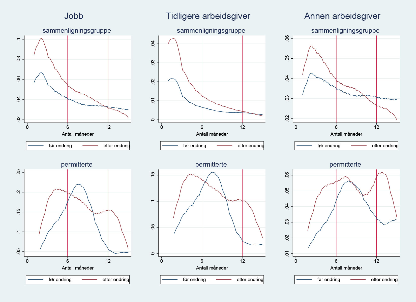 Det er tydelig at sannsynligheten for overgang til arbeid endres med permitteringsregelverket, noe som også er hensikten. I en analyse av tidligere innstramminger og utvidelser av maksimal permitteringsperiode så vi at økt maksimal permitteringsperiode forskjøv overgang til arbeid utover i tid og økte tiden man gikk arbeidsledig, og at sannsynligheten for å komme i jobb gikk ned ved utvidelser (Dokken m.fl. 2017). Nekoei og Weber (2015) fant at permitterte i langt mindre grad søkte ny jobb sammenlignet med ikke-permitterte arbeidsledige i Østerrike. Trolig vil dette også være tilfellet i Norge, siden permitterte også her ofte vil ha forventninger om at de skal tilbake i sin tidligere arbeidsplass, noe som også kan gi mindre geografisk og yrkesmessig mobilitet slik vi fant i Kann m.fl. (2018). En del av de som ikke blir kalt tilbake kan derfor ha fått ledighetsperioden forlenget av permitteringen fordi de kommer sent i gang med å søke annet arbeid, og jo lenger den maksimale permitteringsperioden er, jo lenger blir jobbsøkingen utsatt.