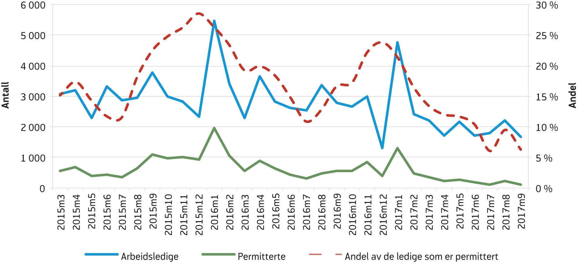 Andelen av de arbeidsledige som er permittert er høyere før regelverksendringen i juli 2016 sammenlignet med perioden etter (figur v2 i vedlegg). Det nye regelverket medfører egentlig ikke at permittering blir dyrere for bedriftene, siden de har samme arbeidsgiverperiode i starten, og de med regelverket før endringen i juli 2016 måtte ta permitterte tilbake etter 32 uker (altså før de nå etter regelendringen må betale en ekstra uke). Det er derfor antagelig andre årsaker (som bedring i konjunkturene) som har ført til at det er noe færre som blir permittert etter endringen i permitteringsregelverket.