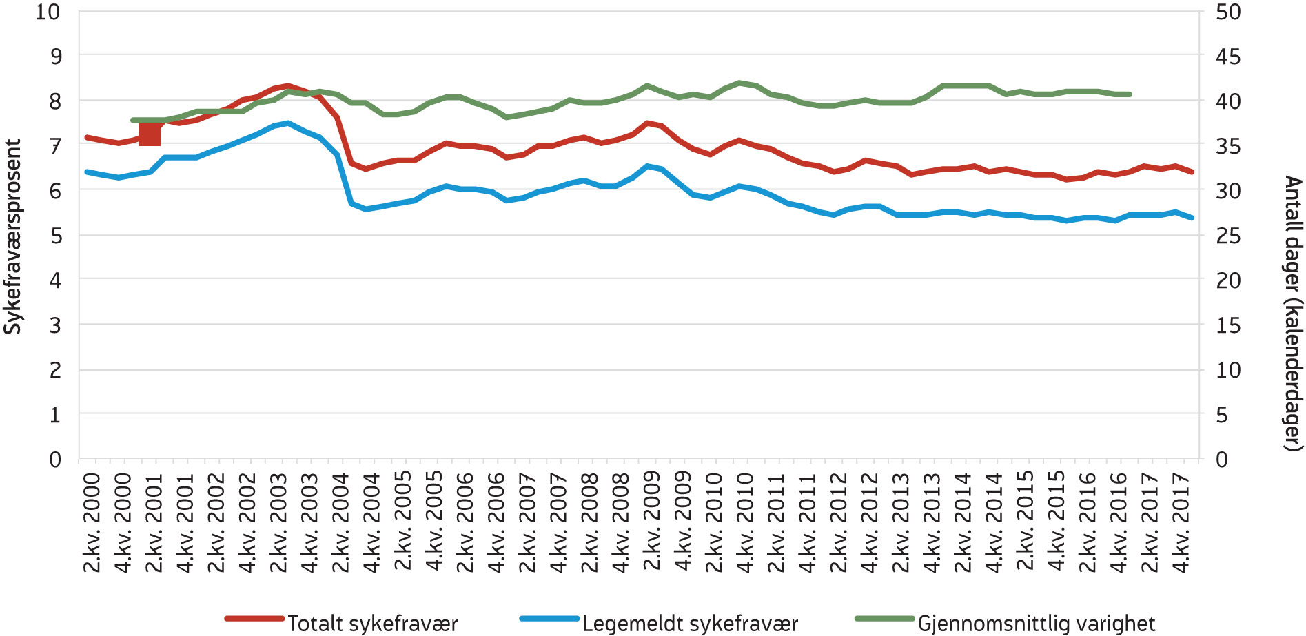 I kjølvannet av ekspertgruppas rapport og den nye IA-avtalen i 2010 ble det iverksatt en rekke informasjons- og samhandlingstiltak rettet mot leger og arbeidsgivere, samt de sykmeldte selv, for å bidra til økt arbeidsdeltakelse og økt bruk av gradert sykmelding. Men selv om sykefraværet har gått noe ned, er delmål 1 om en reduksjon på 20 prosent fortsatt ikke oppfylt. Når vi ser bort fra fallet i 2004 og mer kortvarige svingninger blant annet knyttet til finanskrisen i 2009, har det totale sykefraværet vært nokså stabilt (jf. den mørkeblå kurven i figur 1). Etter en nedgang i 2011–2012 har sykefraværet vært om lag på samme nivå som den første tiden etter regelverksendringene i 2004. Sesongjusterte tall per første kvartal 2018 viser en reduksjon på 11 prosent sammenlignet med referansekvartalet (andre kvartal 2001; markert med en firkant på kurven). Nedgangen i det legemeldte sykefraværet har vært noe større (lyseblå kurve i figur 1), men samtidig har det vært en viss økning i det egenmeldte sykefraværet (differansen mellom disse to kurvene).