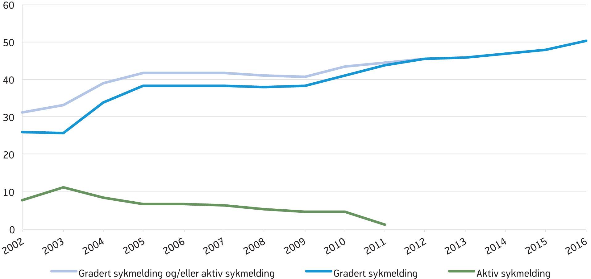 Selv når vi ser på gradert sykmelding og aktiv sykmelding under ett, har det vært en betydelig økning i perioden. Andelen med ett av eller begge disse virkemidlene økte fra 31 prosent i 2002 til 50 prosent i 2016, en økning på 19 prosentpoeng (eller en relativ økning på 61 prosent). Etter en markant økning i 2004 og 2005, var andelen stabil fram til og med 2009. Også fra 2009 til 2011 økte andelen med gradert eller aktiv sykmelding, selv om det var i denne perioden ordningen med aktiv sykmelding ble avviklet.