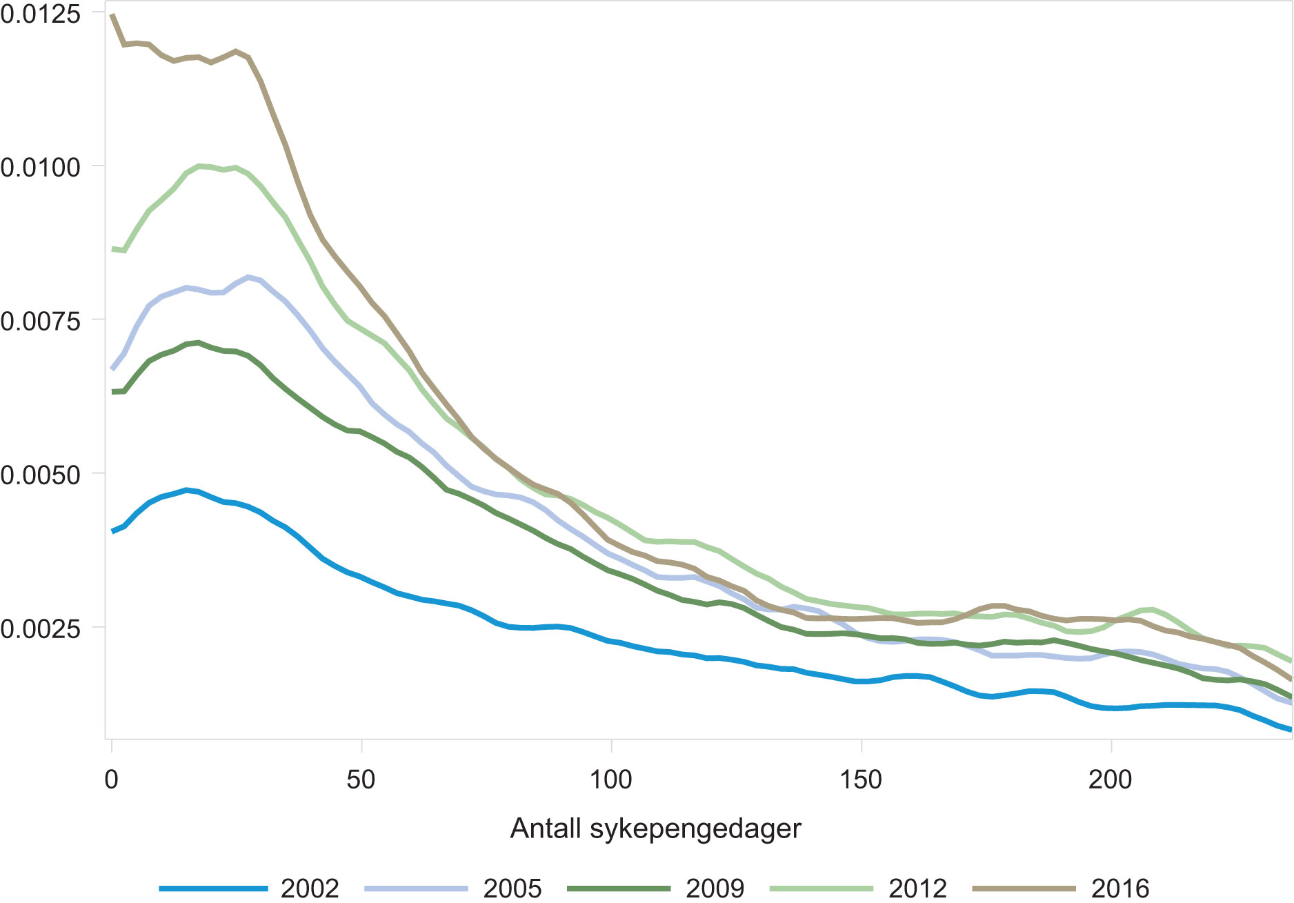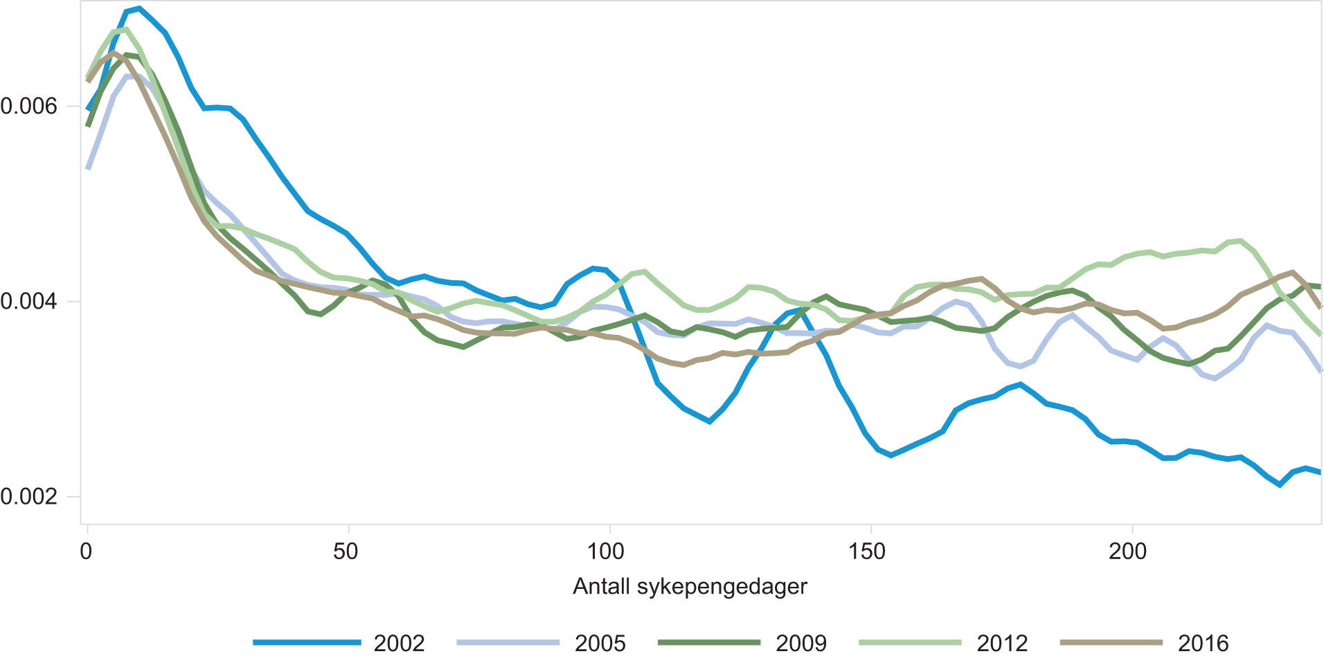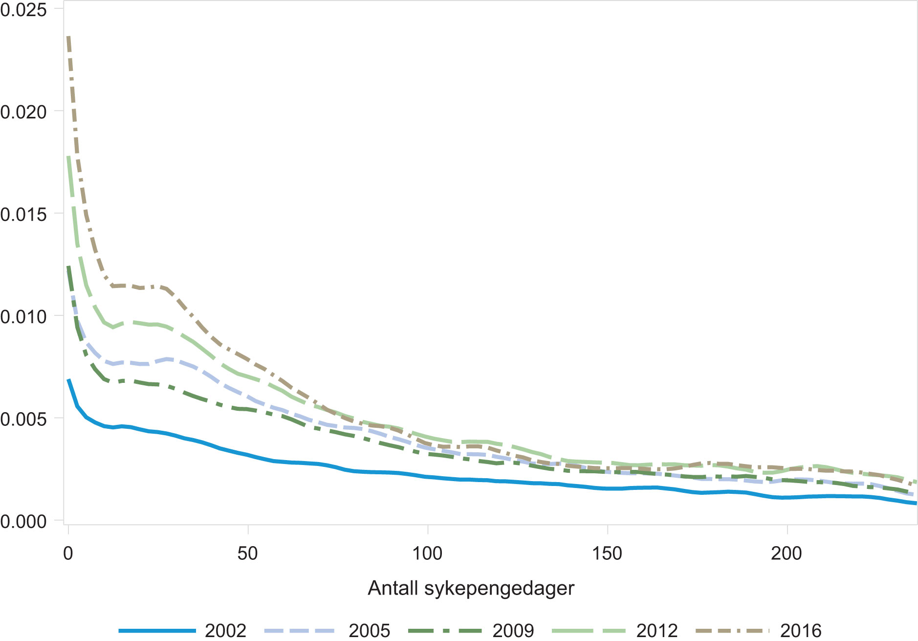 Fra 2002 til 2016 var det en markant økning i overgangen fra full til gradert sykmelding, og vi ser at økningen var størst de første ukene av sykepengeperioden. I de fleste årene er overgangen til gradert sykmelding høyest etter om lag 20–30 sykepengedager, som tilsvarer en varighet på 6–8 uker når vi legger til arbeidsgiverperioden på 16 kalenderdager. Deretter avtar overgangen forholdsvis jevnt utover i forløpet. I hovedsak er formen på forløpskurven lik alle årene, og gjennomgående har overgangen til gradering økt fra år til år, med perioden fra 2005 til 2009 som unntak, hvor overgangen gikk noe ned. Trolig har dette sammenheng med finanskrisen i 2008–2009, som for mange bedrifter betydde en kraftig reduksjon i etterspørselen, og kanskje en mindre positiv innstilling til gradert sykmelding som en følge av dette. Mønsteret i de ulike årene er mindre tydelig etter om lag 100 sykepengedager (22 uker).
