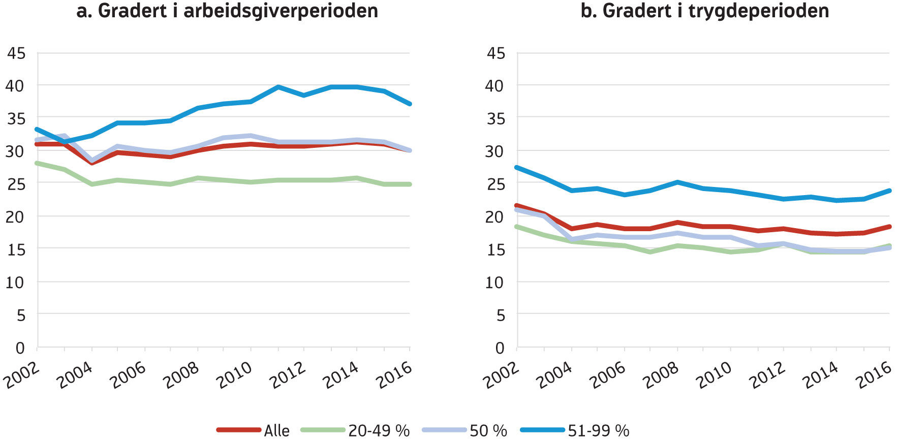 Andelen av sykepengetilfellene som har gradert sykmelding på noe tidspunkt er bortimot doblet de siste 15 årene, og i 2016 var halvparten av sykepengetilfellene med en varighet på over 16 dager graderte. Veksten i bruken av gradering var størst fra 2003 til 2005 (13 prosentpoeng), men det har vært en nesten like stor økning fra 2009 til 2016 (12 prosentpoeng). I begge periodene var økningen til en viss grad en følge av redusert bruk av aktiv sykmelding, en ordning som nå er avviklet.