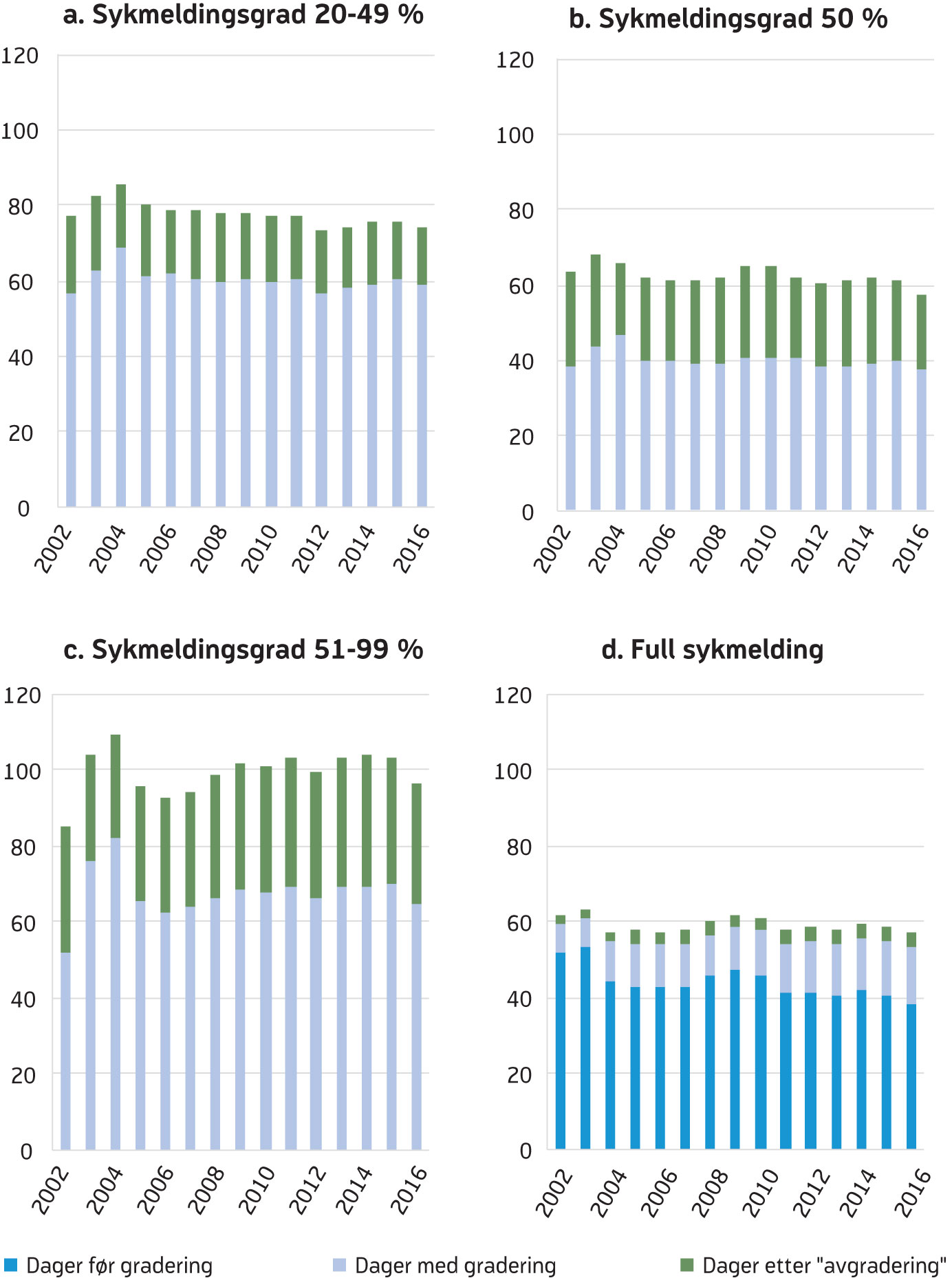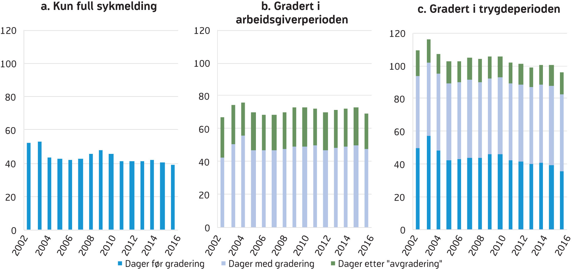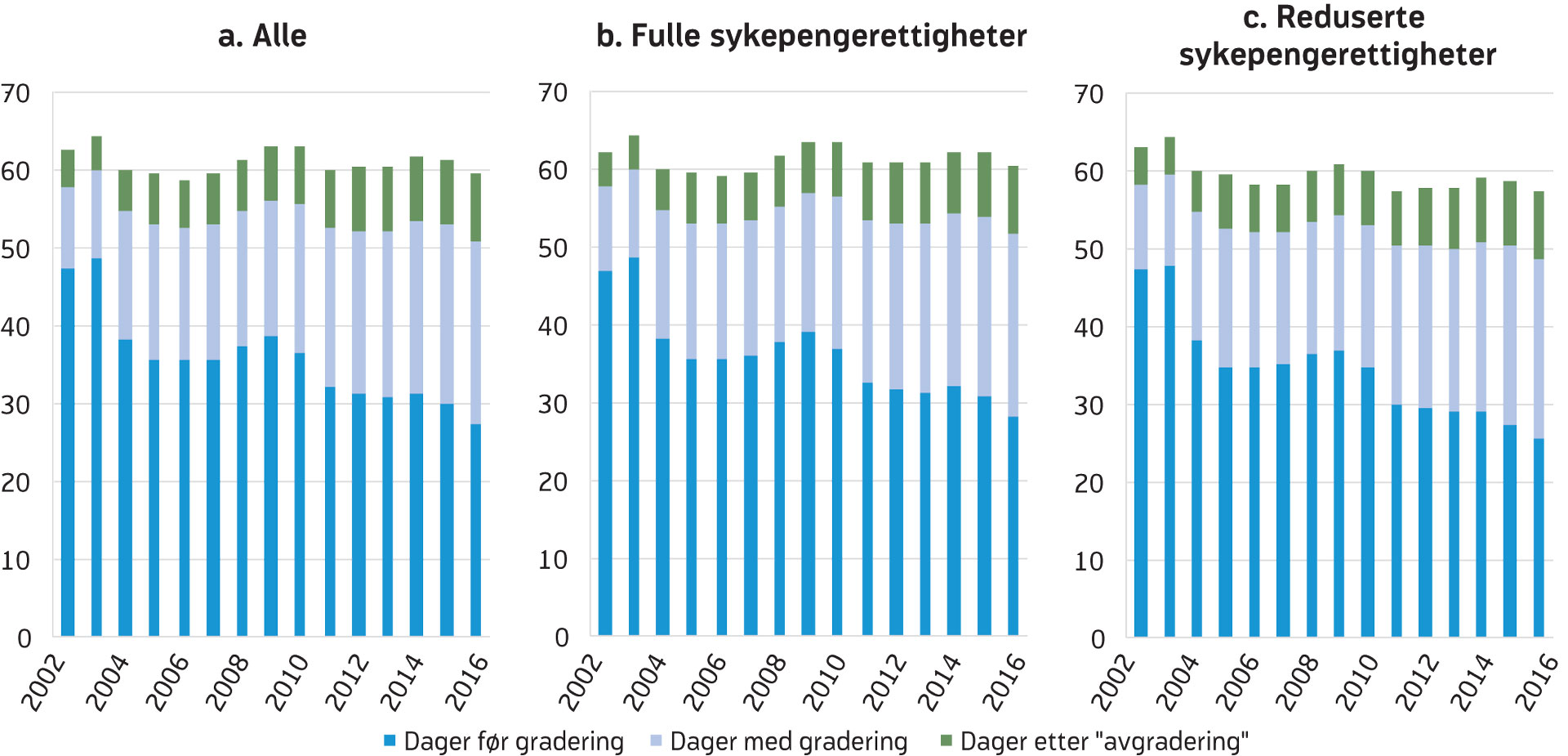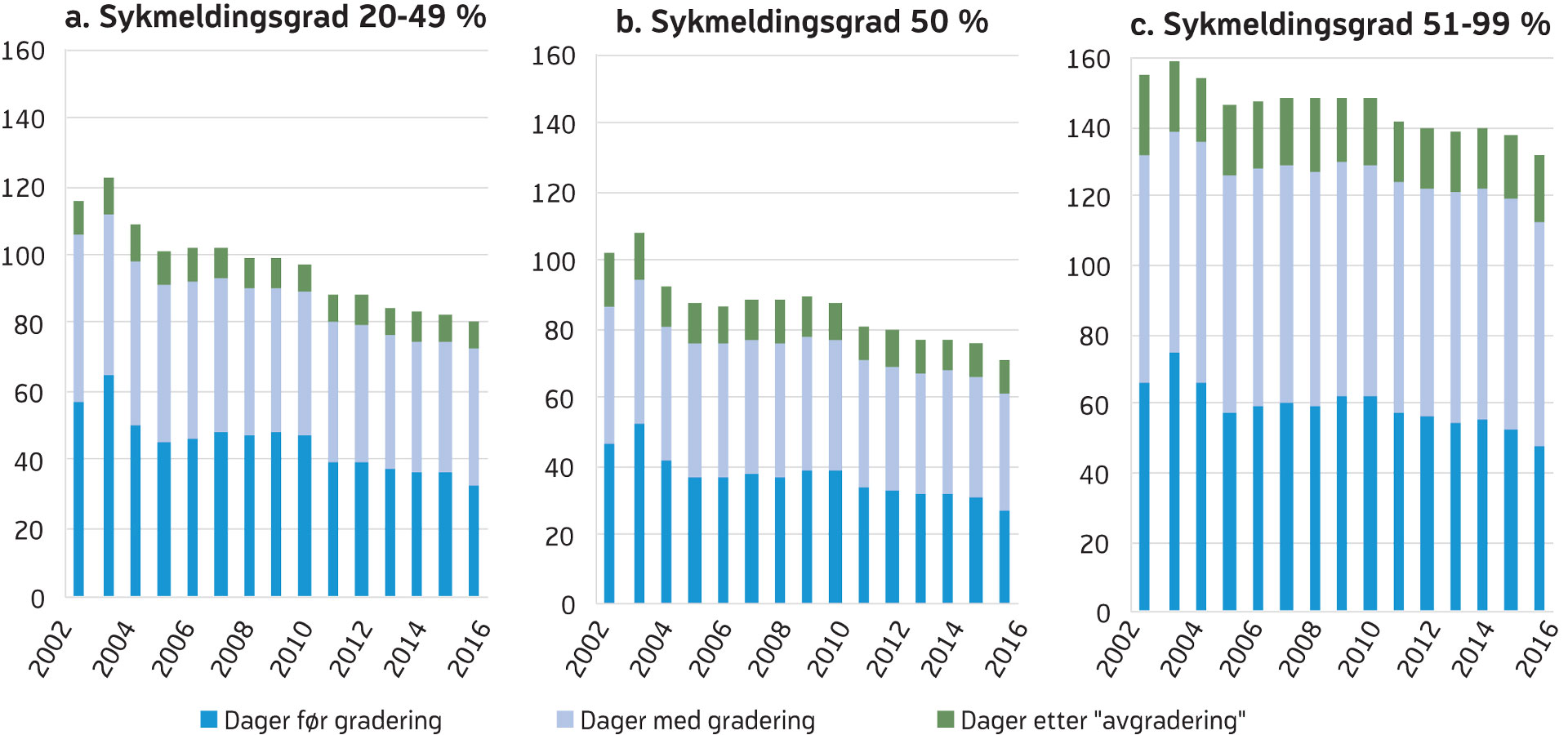 Vi finner at perioden med full sykmelding før (eventuell) overgang til gradert sykmelding har blitt kraftig redusert fra 2002 til 2016, noe som åpenbart henger sammen med den sterke økningen i bruken av gradering, og særlig allerede i arbeidsgiverperioden (som her framkommer som 0 dager før gradering). Nedgangen i antall dager før gradering motsvares av en økning i tiden på gradert sykmelding, men også i tiden etter «avgradering». Totalt sett er det altså relativt små endringer i sykefraværets samlede varighet. Her må det understrekes at sykefraværet likevel blir redusert når flere av fraværsdagene er graderte og flere arbeidstakere dermed benytter restarbeidsevnen.