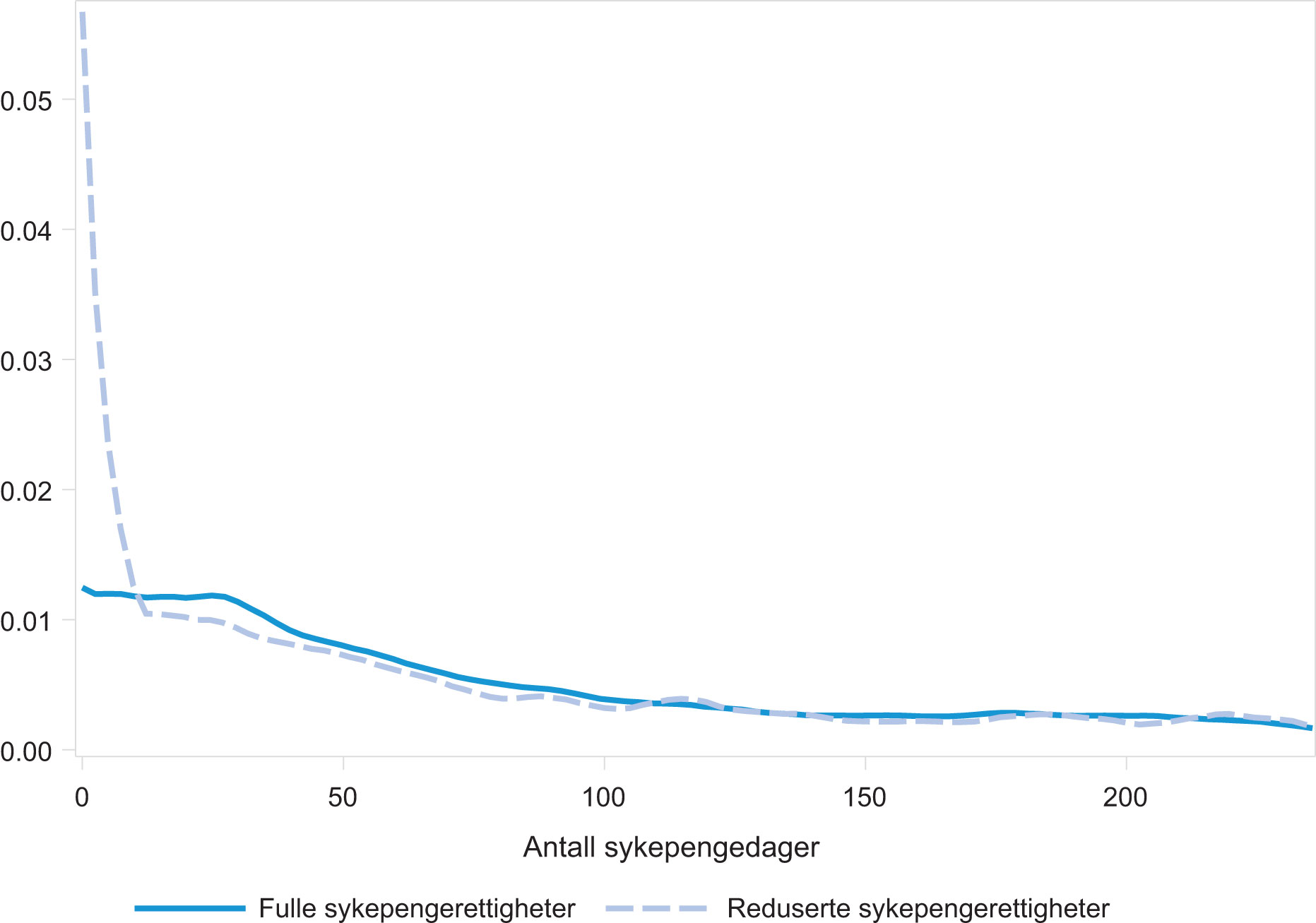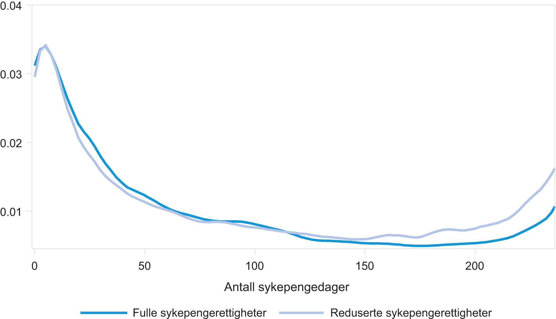 Her ble det ingen endringer av betydning når vi også inkluderte sykmeldte med reduserte sykepengerettigheter (ikke vist i figur).