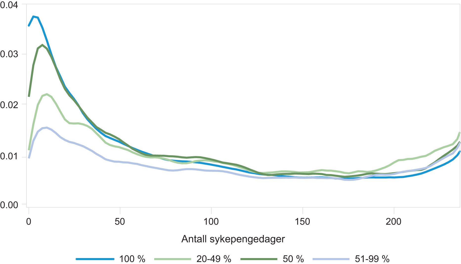 Dersom vi tar med sykmeldte med reduserte sykepengerettigheter, får vi et noe annet bilde. Sannsynligheten for gradering er da størst første dag (figur V1 i vedlegg). Årsaken er at sykmeldte uten forutgående arbeidsgiverperiode har en markant høyere andel med gradering fra første dag (som for andre er 17. dag), noe som slår tydelig ut også totalt. Dette er i tråd med at sykmeldte med arbeidsgiverperiode (som vi har sett) ofte får gradering fra første dag. Sykmeldte uten arbeidsgiverperiode er nok likevel i en slags mellomstilling ved at de får sykepenger fra NAV fra første dag, men bare har hatt et kort opphold siden forrige sykepengetilfelle slik at det ikke strengt tatt er et nytt tilfelle. En sammenligning av graderingsmønsteret for gruppene med fulle og reduserte sykepengerettigheter i 2016 er også lagt i vedlegg (figur V2).
