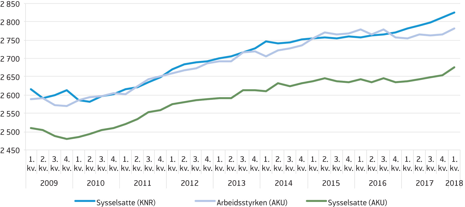 Sysselsettingen målt med SSBs arbeidskraftsundersøkelse (AKU) har vist en svakere utvikling de siste årene enn tallene fra KNR[2]Sysselsettingen målt ved AKU inkluderer kun personer registrert bosatte i Norge, og er derfor lavere enn sysselsettingen slik den beregnes i kvartalsvis nasjonalregnskap. Sistnevnte inkluderer også sysselsatte på korttidsopphold, det vil si midlertidig sysselsatte som ikke er registrert bosatte, samt sysselsatte i utenriks sjøfart.. Ifølge AKU var sysselsettingen relativ stabilt i både 2015 og 2016. I fjor økte sysselsettingen med 5 000 i gjennomsnitt hvert kvartal, men i første kvartal i år økte sysselsettingen med hele 21 000 personer. Dermed har utviklingen i antall sysselsatte ifølge AKU og KNR nærmet seg hverandre det siste året. Veksten i sysselsettingen har vært noe større enn veksten i befolkningen i yrkesaktiv alder det siste året, og dermed har andelen av befolkningen mellom 15 og 74 år som er sysselsatt økt fra 66,2 prosent i første kvartal 2017 til 66,8 prosent i første kvartal 2018, ifølge AKU. Sysselsettingsandelen har særlig økt blant de mellom 15–24 år i perioden.