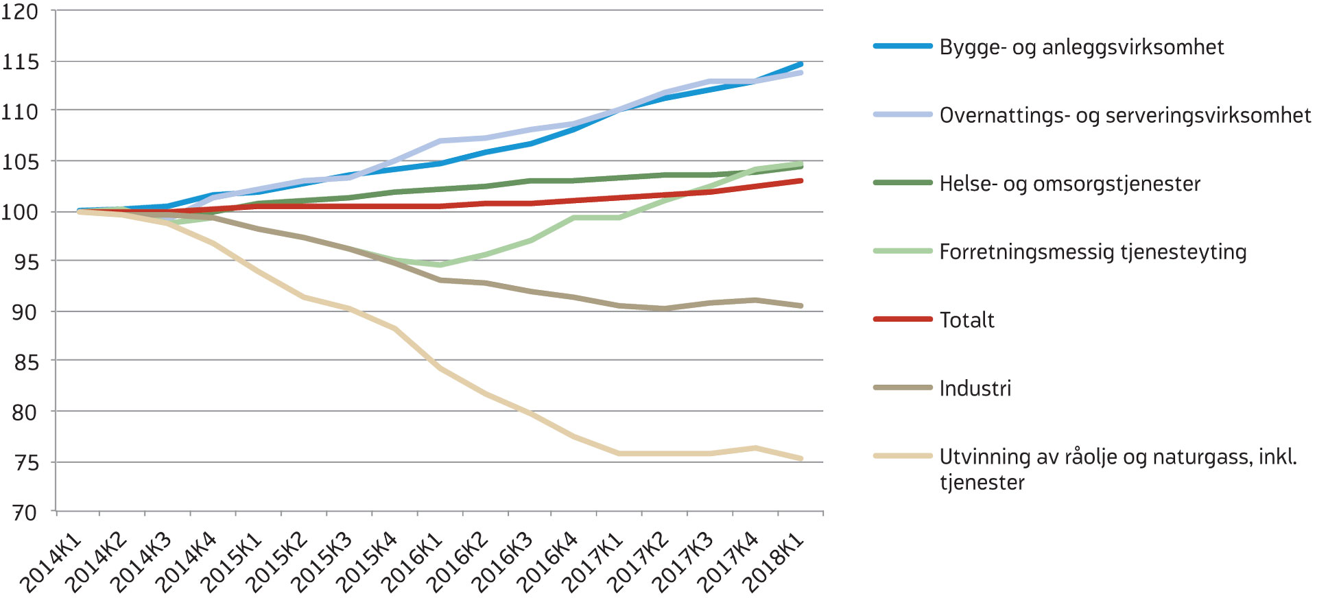 Veksten i sysselsettingen tok seg opp gjennom 2017, ifølge sesongjusterte tall fra kvartalsvis nasjonalregnskap (KNR). Sysselsettingen økte med 10 000 personer i gjennomsnitt hvert kvartal, som er en klart høyere veksttakt enn i 2015 og 2016 (figur 1). Sysselsettingen har fortsatt å ta seg opp i år og økte med 15 000 personer i første kvartal. Det siste året har sysselsettingsveksten vært størst innen bygg og anlegg, forretningsmessig tjenesteyting samt overnattings- og serveringsvirksomhet (figur 2). Sysselsettingen innen bygg og anlegg og overnattings- og serveringsvirksomhet har økt gjennom hele den oljerelaterte nedgangskonjunkturen vi har hatt siden starten av 2014, noe som henger sammen med kraftig vekst i boliginvesteringene, høye samferdselsinvesteringer og at den svake kronekursen har vært gunstig for turistnæringen. Etter tre år med nedgang, sluttet sysselsettingen innen oljerelaterte næringer å falle ved årsskifte 2016/2017 og har holdt seg relativt stabilt siden. Sysselsettingen innen industrien har, sett under ett, også holdt seg relativt stabil det siste året. Den har imidlertid falt noe innen den oljerelaterte industrien, og etter en oppbremsing i andre halvår i fjor, falt den igjen i første kvartal. I andre deler av industrien har det vært stabil eller svakt økende sysselsetting det siste året.