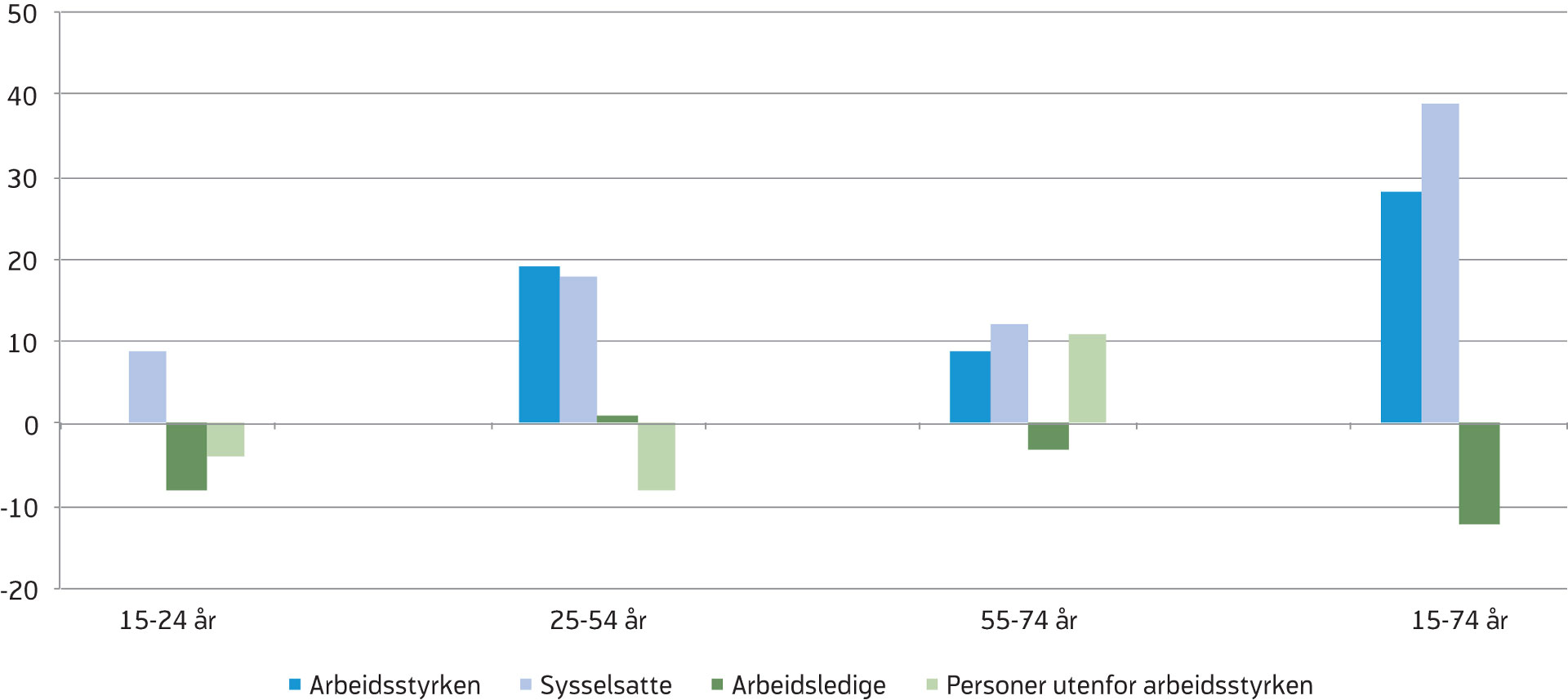 I første kvartal i år var det 28 000 flere personer i arbeidsstyrken enn i første kvartal 2017 (figur 3). Sysselsettingen økte med 39 000 personer og arbeids­ledigheten falt med 12 000. Alle aldersgrupper hadde en økning i antall sysselsatte, men mens arbeidsledigheten falt for de mellom 15–24 år og de mellom 55–74 år, økte den noe for de mellom 25–54 år. I samme perioden økte befolkningen mellom 15 og 74 år med 27 000 personer. Sett under et er antall utenfor arbeidsstyrken på samme nivå som for ett år siden. Sammenliknet med for ett år siden, er det færre under 54 år som står utenfor arbeidsstyrken, mens det er noen flere over 55 år.