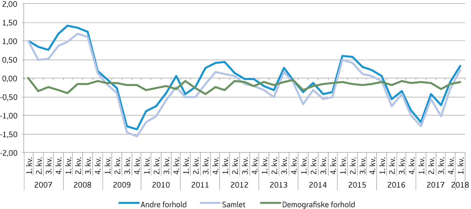 Figur 4. Årlig endring i samlet yrkesdeltakelse og bidrag fra demografiske og andre forhold. Prosentpoeng