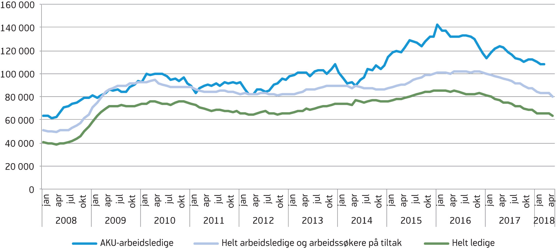 På grunn av en økning i tiltaksnivået begynte antallet helt ledige å falle allerede våren 2016, men gjennom 2017 var utviklingen i antallet helt ledige og brutto­ledigheten relativt lik. De siste månedene har vi sett en større nedgang i antall arbeidssøkere på tiltak, mens antall helt ledige har falt noe mindre enn bruttoledigheten. Fra desember til mai falt antall helt ledige med 4 500 ifølge sesongjusterte tall. 60 000 personer var registrert som helt ledige ved utgangen av mai. Det utgjorde 2,2 prosent av arbeidsstyrken, mot 2,6 prosent i mai 2017.