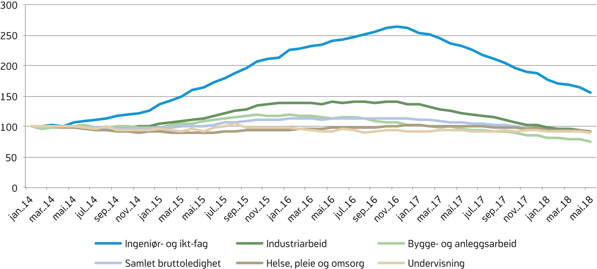 Også innen industriarbeid har bruttoledigheten gått ned siden desember 2016, etter en økning på omtrent 40 prosent fra januar 2014 til januar 2016. Ledigheten innen denne yrkesgruppen er nå på et lavere nivå enn den var i januar 2014. Innen yrkesgruppene undervisning og helse, pleie og omsorg har ledigheten holdt seg stabil de siste tre årene. Dette er også blant yrkesgruppene med lavest ledighetsrate. Innen bygg og anlegg økte ledigheten gjennom 2015. De siste to årene, og spesielt det siste året, har ledigheten gått betydelig ned innen denne yrkesgruppen, med 2 200 personer eller 23 prosent fra mai 2017 til mai 2018.