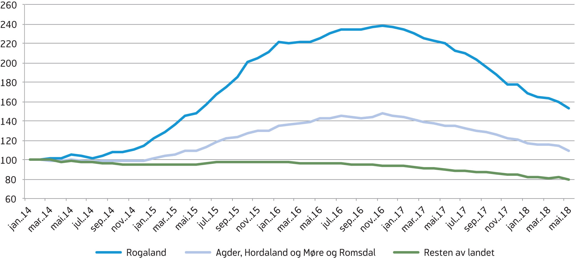 De siste tre årene har vært preget av store geografiske forskjeller på arbeidsmarkedet. Nedgangen i oljebransjen og oljerelatert industri har først og fremst rammet Sør- og Vestlandet og særlig Rogaland. I Rogaland ble bruttoledigheten mer enn doblet fra januar 2014 til november 2016 (figur 9), og fylket gikk fra å ha nest lavest ledighet til å ha den høyeste ledigheten i landet. Også i Agder-fylkene, Hordaland og Møre og Romsdal økte bruttoledigheten klart som følge av lavere aktivitet i oljebransjen, men langt mindre enn i Rogaland. I resten av landet samlet holdt bruttoledigheten seg ganske stabil gjennom nedgangskonjunkturen, og begynte å gå svakt ned allerede våren 2016. Fra og med desember 2016 har bruttoledigheten også gått ned på Sør- og Vestlandet. Nedgangen har vært størst i Rogaland, med 36 prosent fra november 2016 til mai i år. Likevel var Rogaland (sammen med Finnmark) fortsatt fylket med høyest bruttoledighet i mai, med 3,5 prosent av arbeidsstyrken.