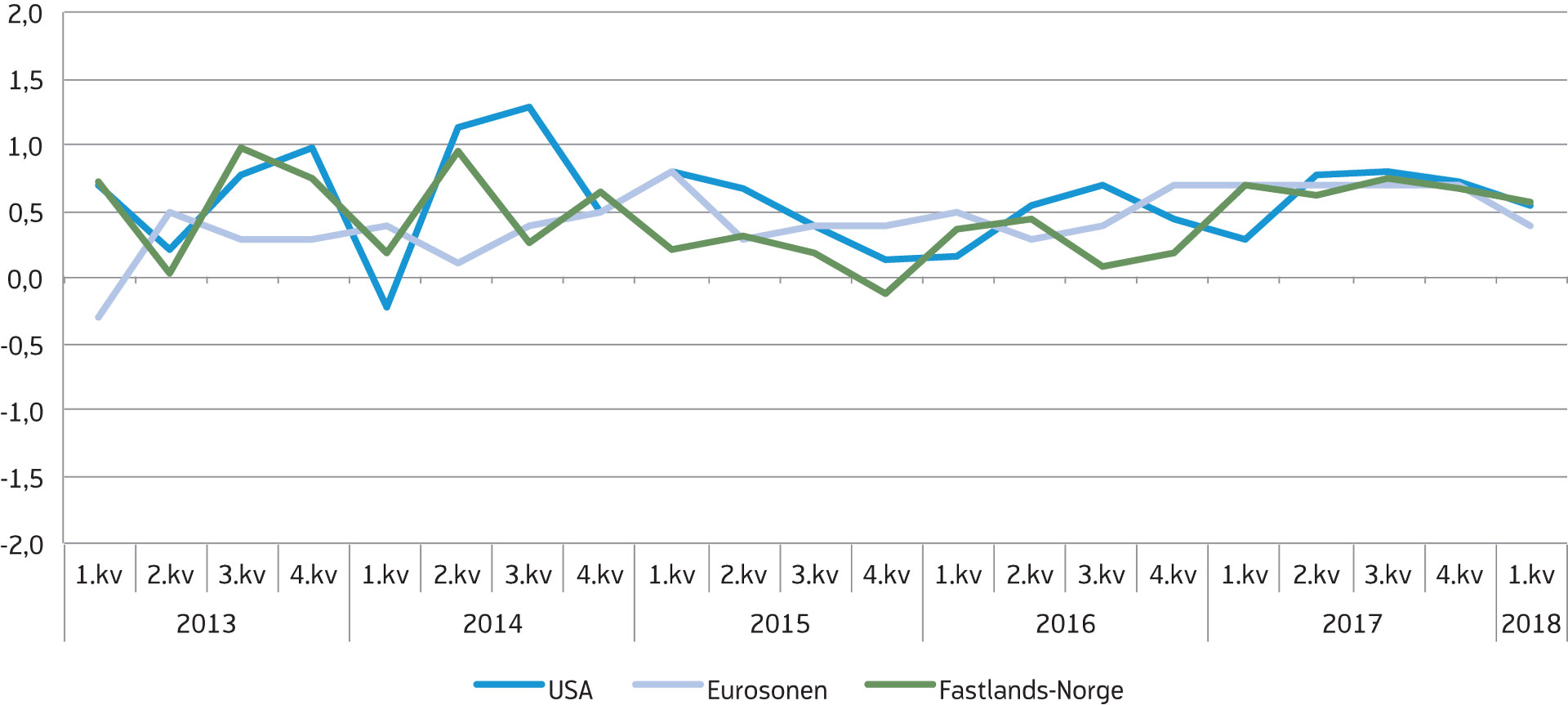 Ifølge sesongjusterte tall fra nasjonalregnskapet økte bruttonasjonalprodukt (BNP) for Fastlands-Norge[8]Bruttonasjonalprodukt for Fastlands-Norge er lik bruttonasjonalprodukt (BNP) utenom næringene utvinning av olje og naturgass, rørtransport og utenriks sjøfart. med 0,6 prosent i første kvartal i år. Høyere vekst i offentlig konsum og i eksport av tradisjonelle varer enn i fjerde kvartal i fjor bidro til å trekke veksten i Fastlands-BNP opp, mens et fall i bruttoinvesteringene samt null vekst i privat konsum bidro negativt. Siden begynnelsen av 2017 har fastlandsøkonomien vist en jevn vekst på cirka 0,7 prosent hvert kvartal (tabell 1). Dette tilsvarer en kvartalsvis vekst på rundt 2,7 prosent målt i årlig rate, som er over trendveksten på 2 prosent.[9]Trendveksten er en estimert størrelse. SSBs siste estimat av den årlige trendveksten for BNP Fastlands-Norge er på 2 %. En oppgangskonjunktur er definert som en periode der veksten i BNP for Fastlands-Norge er høyere enn trendveksten. Dermed har Norge vært inne i en moderat oppgangskonjunktur i fem kvartaler på rad, etter to år med en nedgangskonjunktur drevet av redusert etterspørsel fra petroleumsnæringen.