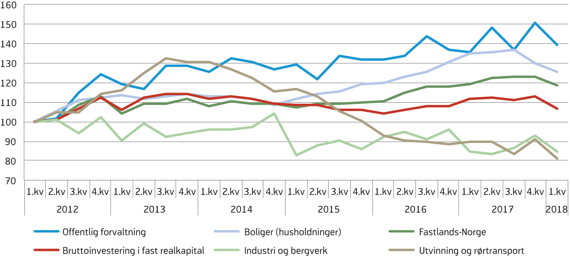 Etter to år med nedgang, i stor grad på grunn av lavere produksjon i næringene som leverer til oljeindustrien, hadde bruttoproduktet i industrien en liten økning i 2017 (figur 12). Høy vekst innen oljeraffinering, kjemisk og farmasøytisk industri i bidro til oppgangen i industriproduksjonen, samtidig som produksjonsnedgangen blant oljeleverandørene flatet ut. I første kvartal i år var industriproduksjonen omtrent uendret fra fjerde kvartal, men sammensettingen var noe annerledes. Oljerelaterte industrinæringer, som metallvareproduksjon og særlig verftsindustri, bidro til å trekke opp industriproduksjonen, mens blant annet næringsmiddelindustrien, oljeraffinering og kjemisk råvareproduksjon trakk ned.