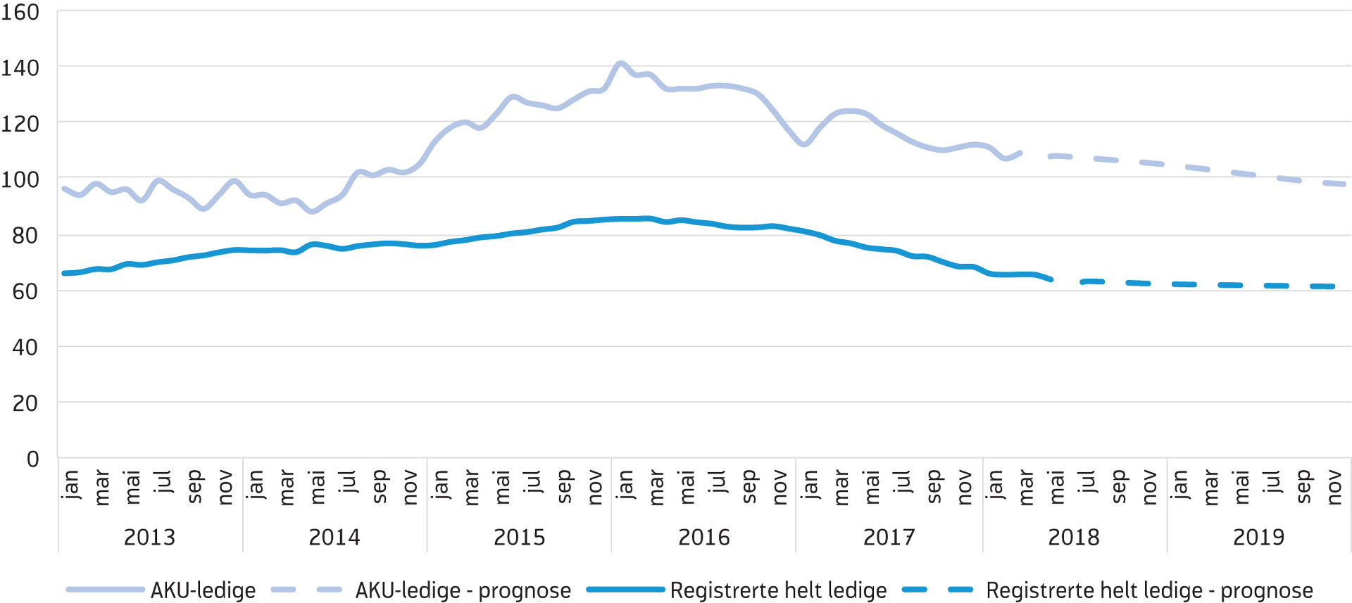 Norge er nå inne i en moderat oppgangskonjunktur som vi venter vil fortsette både dette året og neste år, noe som vil bidra til at sysselsettingen tar seg videre opp. Vi venter derfor at den registrerte ledigheten fortsetter å gå ned, men saktere enn det siste året. Det skyldes at vi også venter at antall personer i arbeidsstyrken vil øke raskere i år og neste år enn det har gjort de siste årene. Vi anslår at antallet helt ledige vil bli på 64 000 i gjennomsnitt i år, noe som tilsvarer en ledighet på 2,3 prosent av arbeidsstyrken. I 2019 venter vi at antallet helt ledige vil ligge på 62 000 i gjennomsnitt, som tilsvarer 2,2 prosent av arbeidsstyrken.