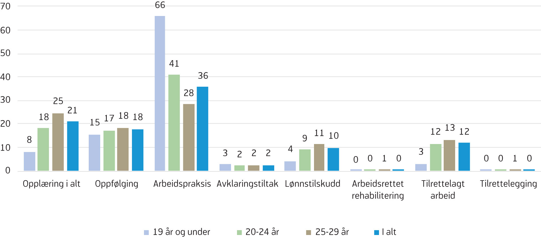 Opplæring er et av flere arbeidsrettede tiltak i Nav. Figur 1 viser hvor stor andel av de på arbeidsrettede tiltak som deltar på opplæringstiltak i ulike aldersgrupper. Opplæringstiltak er vanligere for de eldste unge enn de yngste. Mens opplæringstiltak utgjør 8 prosent av alle på tiltak for de under 20, så utgjør det 25 prosent for de mellom 25 og 29 år. Arbeidspraksis er det vanligste arbeidsrettede tiltaket blant unge, særlig for de under 20 år, der 66 prosent har arbeidspraksis som arbeidsrettede tiltak (figur 1).