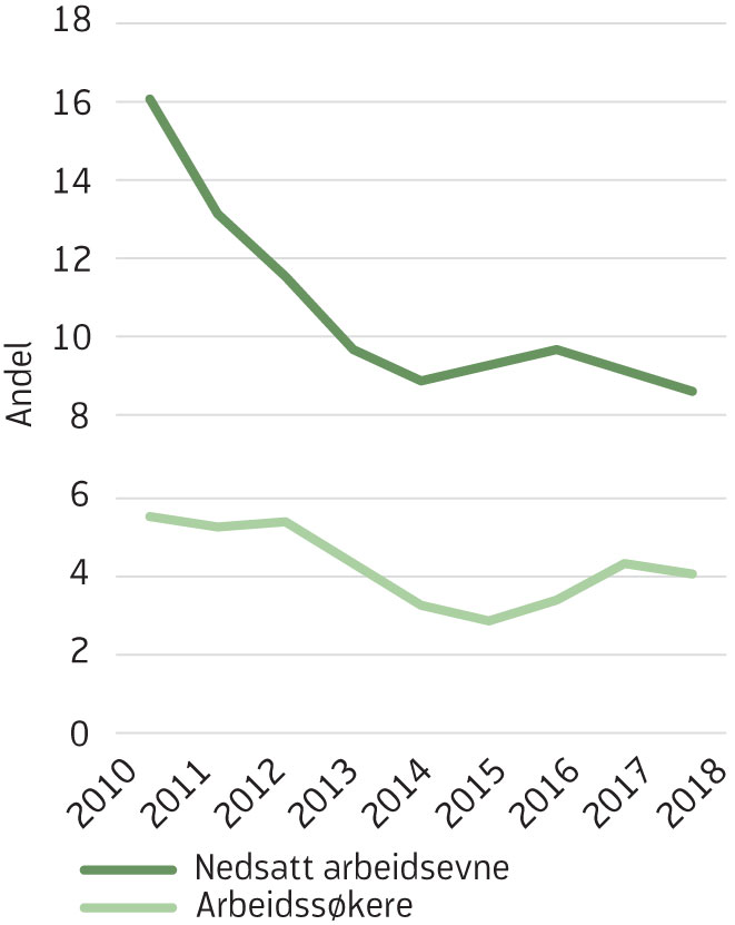 Figur 3 Andel arbeidssøkere og personer med nedsatt arbeidsevne på opplæringstiltak (prosent), 2010–2018, 18–30 åringer