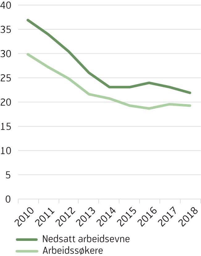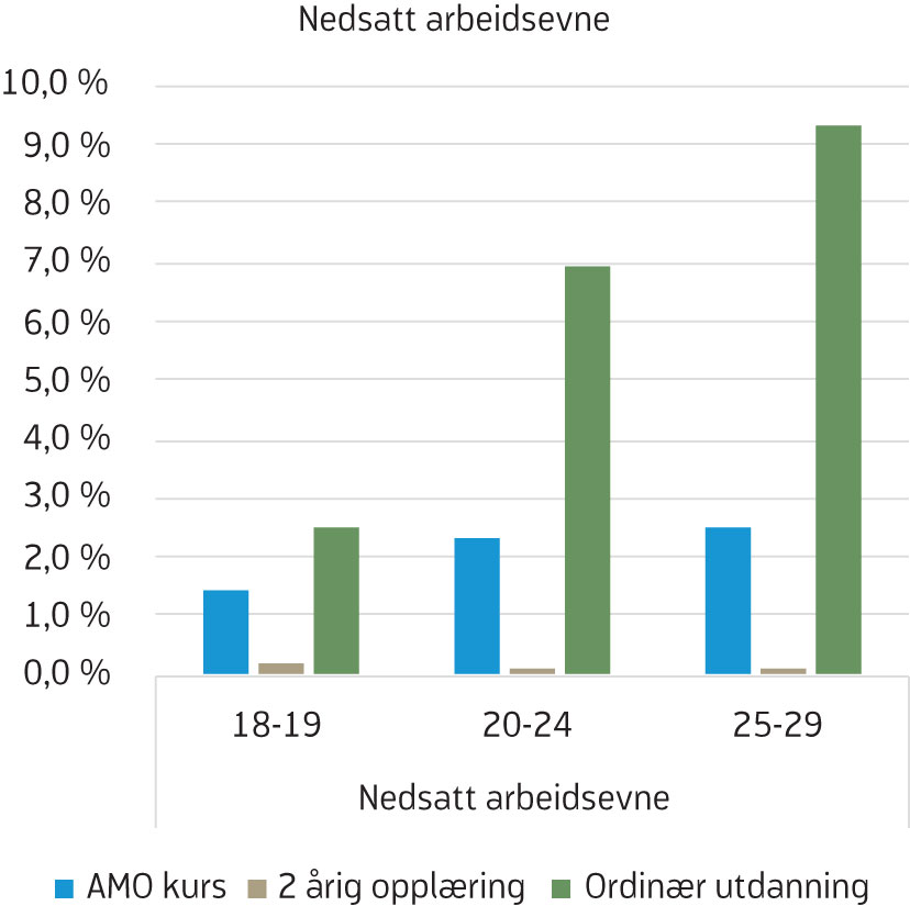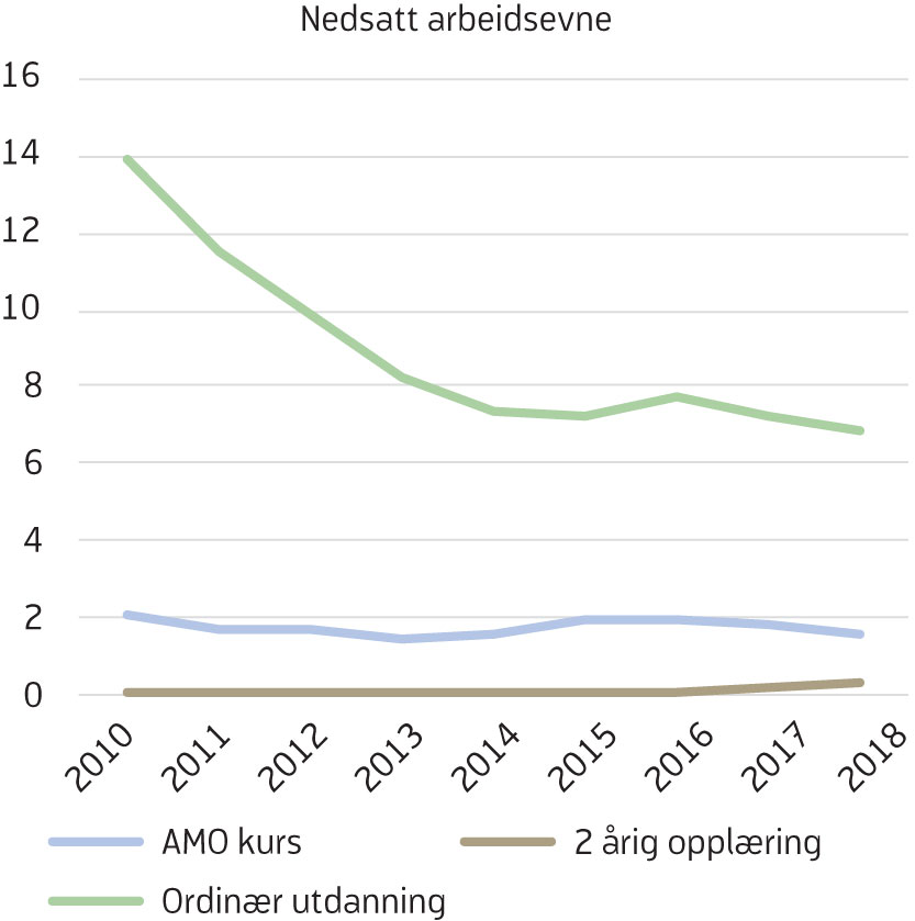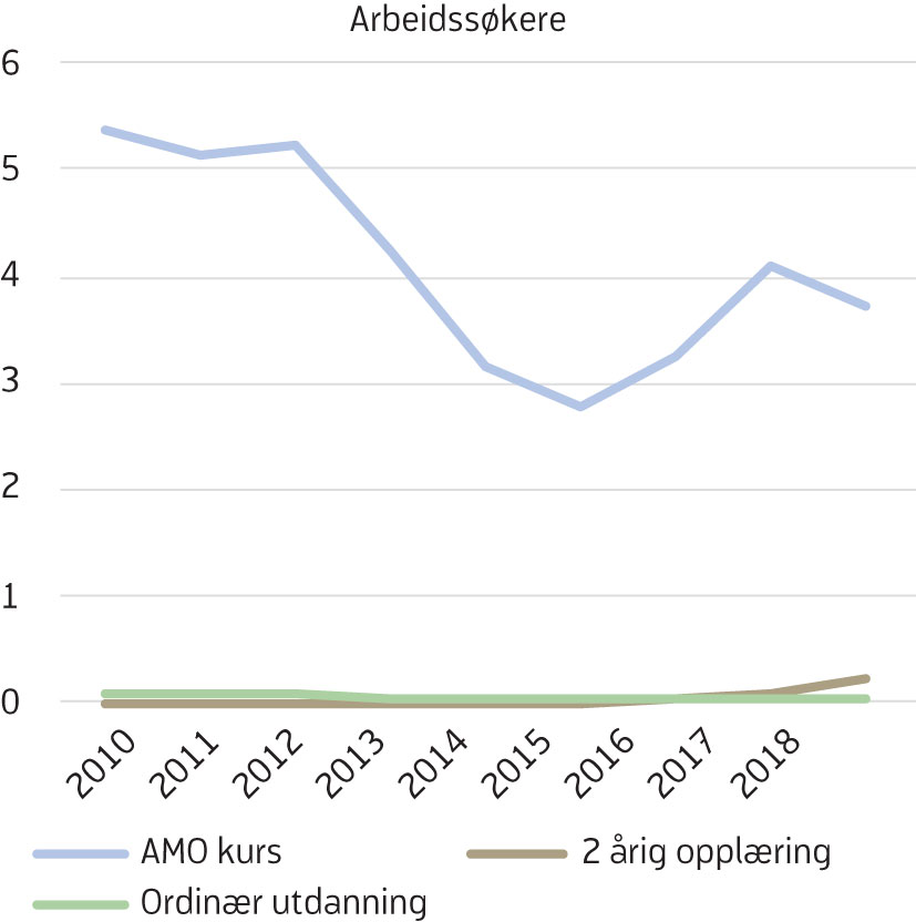 Av de med nedsatt arbeidsevne[4] Antall med nedsatt arbeidsevne per måned i aldergruppen under 30 år i 2018 er 41 900, av disse er 4 333 på opplæringstiltak, hvorav 990 deltar på AMO-kurs og 3343 på andre opplæringstiltak. Antall ordinære arbeidsledige per måned under 30 år er 36 200, av disse er 1670 på opplæringstiltak, hvorav 1637 deltar på AMO-kurs, kun 2 prosent (33 per måned), deltar på andre opplæringstiltak. deltok 40 prosent på et arbeidsrettet tiltak de siste årene (figur 2). Av disse igjen var det om lag en fjerdedel som deltok i opplæringstiltak i 2018 (figur 3). Andelen som deltar på opplæringstiltak blant de med nedsatt arbeidsevne falt kraftig fra 2010 til 2014. Etter en svak økning fra 2014 til 2016, har andelen falt igjen (figur 3). Blant ordinære arbeidssøkere har andelen på arbeidsrettede tiltak samlet sett ligget på mellom 18 og 22 prosent, med topper i 2012 og 2017 (figur 2). Andelen av ordinære arbeidssøkere som deltok på opplæringstiltak ble redusert fra 2010 til 2015, og økte deretter noe. Opplæringstiltak for denne gruppen er i all hovedsak AMO-kurs. Både for de med nedsatt arbeidsevne, og for arbeidssøkere utgjør opplæringstiltak en avtagende andel av de arbeidsrettede tiltakene (figur 4).