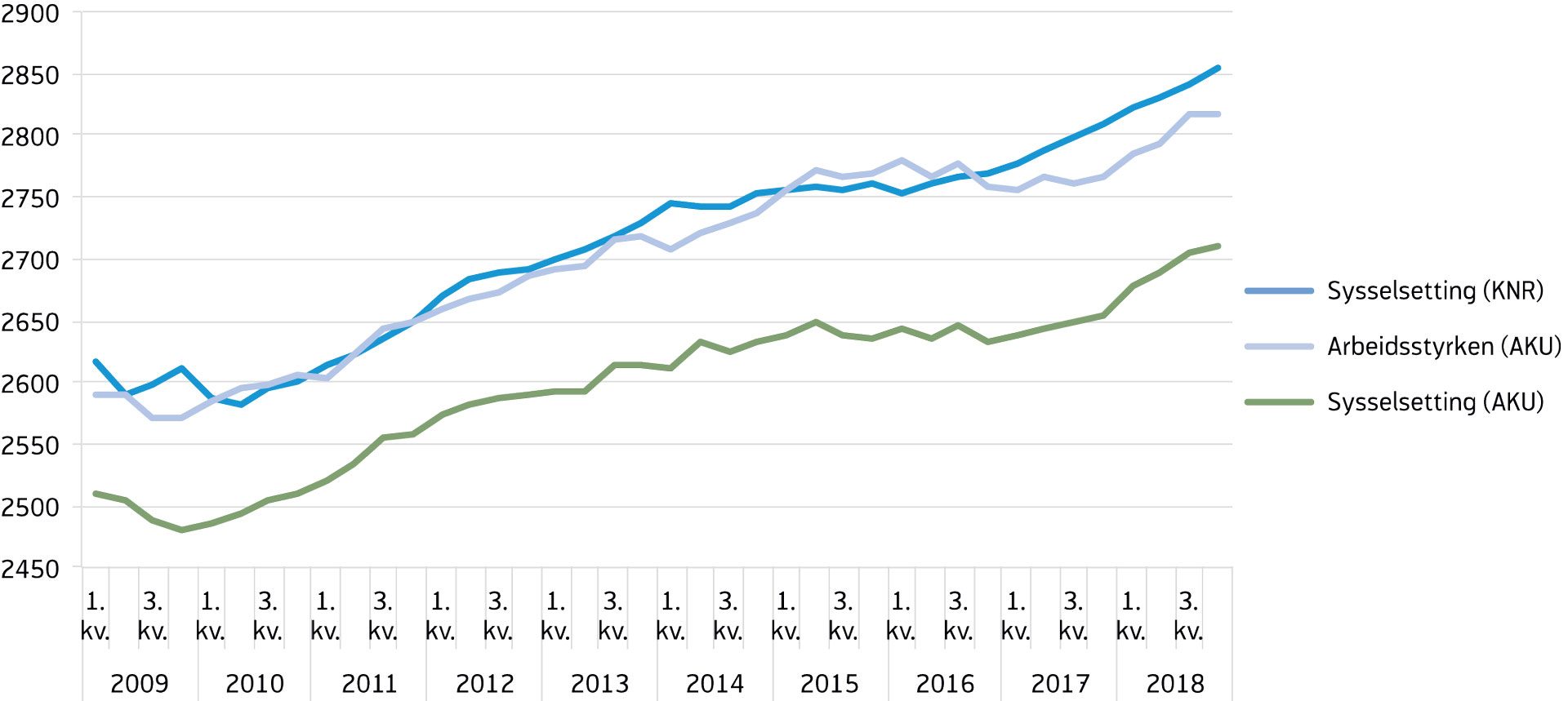 Arbeidsstyrken er summen av de sysselsatte og arbeidsledige i yrkesaktiv alder (15–74 år), og tilsvarer tilbudet av arbeidskraft. Ifølge sesongjusterte AKU-tall fortsatte antall personer i arbeidsstyrken å øke i løpet av 2015, mens det deretter vekslet mellom oppgang og nedgang fram til slutten av 2017. I fjor var det en betydelig økning i arbeidsstyrken. I løpet av de tre første kvartalene i 2018 ble det 50 000 flere personer i arbeidsstyrken, selv om det i fjerde kvartal igjen var en liten nedgang (figur 1).