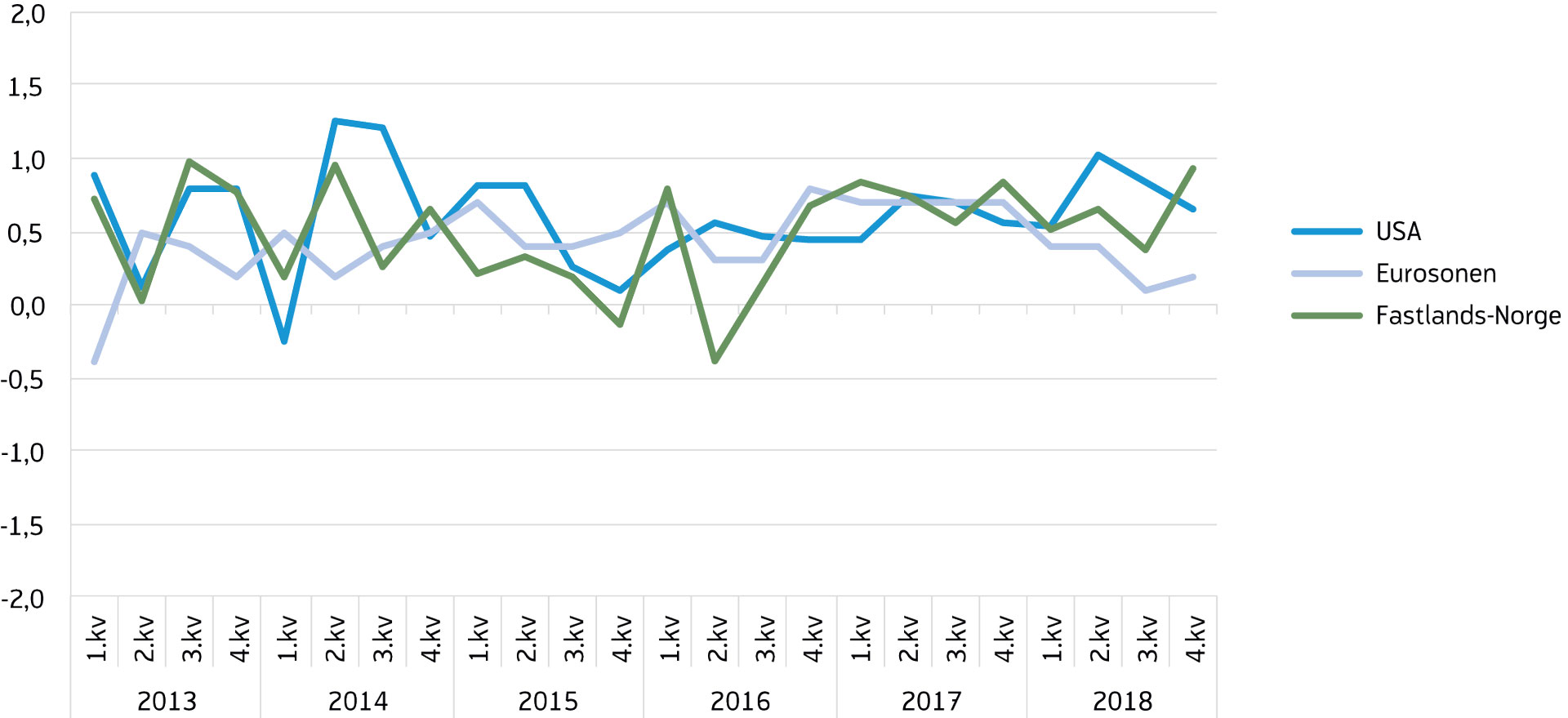 Ifølge sesongjusterte tall fra kvartalsvis nasjonalregnskap (KNR) tiltok veksten i bruttonasjonalprodukt (BNP) for Fastlands-Norge[6] Bruttonasjonalprodukt for Fastlands-Norge er lik bruttonasjonalprodukt (BNP) utenom næringene utvinning av olje og naturgass, rørtransport og utenriks sjøfart. gjennom 2018. I fjerde kvartal økte Fastlands-BNP med 0,9 prosent (tabell 1). Mens en nedgang i jordbruksproduksjonen som følge av tørke trakk ned veksten i tredje kvartal, bidro samme næring til å dra opp veksten i fjerde kvartal. Økt fiskeproduksjon og høyere aktivitet i bygge- og anleggsvirksomhet var også viktige bidrag. Fastlands-BNP økte med 2,2 prosent i 2018. Dette er noe høyere enn året før, da veksten var på 2,0 prosent, og høyere enn trendveksten for fastlandsøkonomien.[7] Trendveksten er en estimert størrelse. SSBs estimat av den årlige trendveksten for BNP Fastlands-Norge er på 2 %. En oppgangskonjunktur er definert som en periode der veksten i BNP for Fastlands-Norge er høyere enn trendveksten.