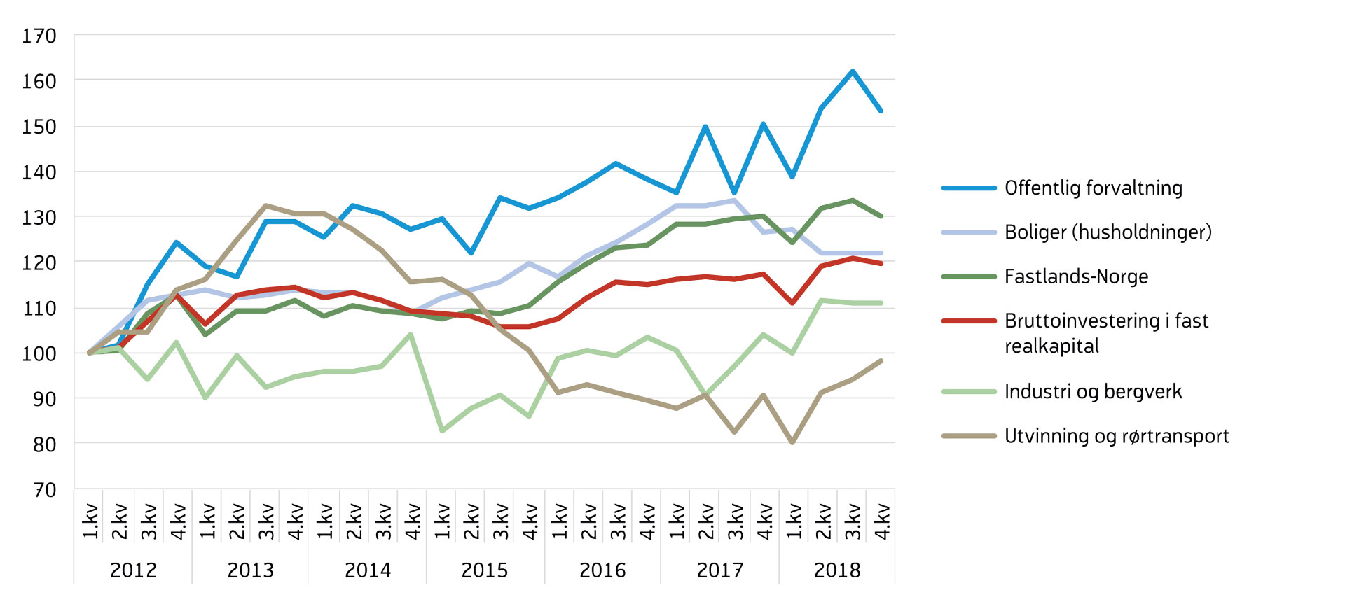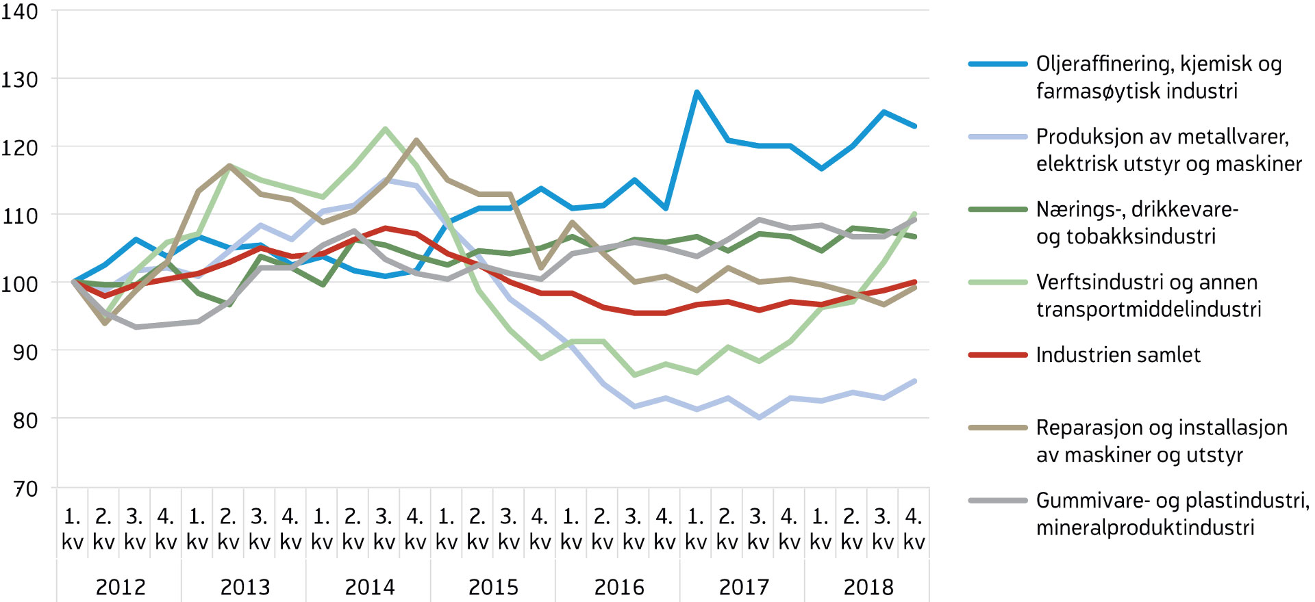 Etter to år med nedgang, i stor grad på grunn av lavere produksjon i næringene som leverer til oljeindustrien, økte bruttoproduktet i industrien noe gjennom 2017 (figur 12). Høy vekst innen oljeraffinering, kjemisk og farmasøytisk industri bidro til oppgangen i industriproduksjonen, samtidig som produksjonen blant oljeleverandørene tok seg opp i fjerde kvartal 2017. Etter nedgang i begynnelsen av 2018 var det en jevn vekst i industriproduksjonen resten av året. For 2018 samlet var industriproduksjonen 0,9 prosent høyere enn i 2017. Det var fortsatt god vekst innen oljeraffinering, kjemisk og farmasøytisk industri, mens næringsmiddelindustri hadde en svak utvikling i fjor. I tillegg var det i fjor en betydelig vekst i produksjonen blant viktige leverandører til oljenæringen, som produsenter av metallvarer, elektrisk utstyr og maskiner, samt verftsindustrien.