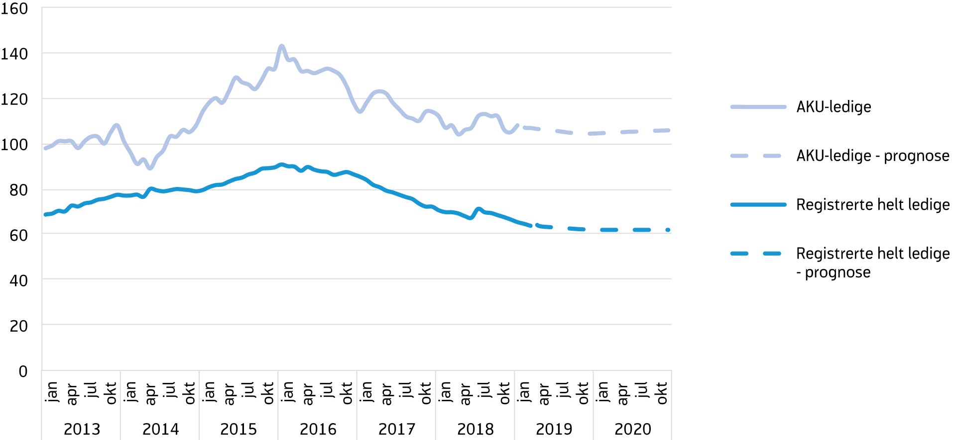 Norge er nå inne i en moderat oppgangskonjunktur som vi forventer vil fortsette i år og neste år. Dette vil bidra til at sysselsettingen tar seg videre opp, men også til at antall personer i arbeidsstyrken fortsetter å øke framover. Vi venter derfor en svak nedgang i den registrerte ledigheten fram til 2020. Vi anslår at antallet helt ledige vil ligge på 63 000 i gjennomsnitt i år og på 62 000 neste år, som tilsvarer henholdsvis 2,3 og 2,2 prosent av arbeidsstyrken.