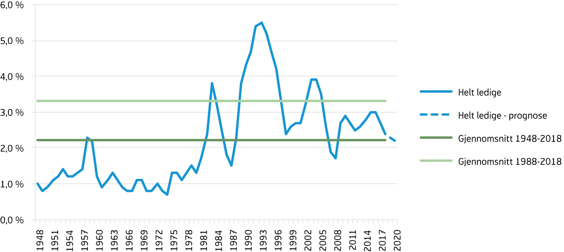 AKU-ledigheten var i januar på 3,9 prosent av arbeidsstyrken ifølge sesongjusterte tall, eller 1,2 prosentpoeng lavere enn toppen i januar 2016. De siste månedene har AKU-ledigheten vekslet mellom oppgang og nedgang, men trenden viser en stabil arbeidsledighet på cirka 3,8 prosent. Ifølge vår prognose vil den fortsette å gå svakt ned resten av året, da vi venter noe høyere vekst i sysselsettingen enn i arbeidsstyrken, og så holde seg stabil i 2020 (figur 14). Etter halvannet år med nedgang økte både bruttoledigheten og antall helt ledige betraktelig i juli i fjor. Denne økningen kan blant annet sees i sammenheng med innføring av SMS-påminnelse til arbeidsledige om å fornye registreringen, og som det ikke korrigeres for i sesongjusteringen. Etter dette har antall helt ledige og bruttoledigheten fortsatt å gå ned ifølge tall som er både sesongkorrigert og justert for bruddet i statistikken.[9] For nærmere forklaring om bruddet og øvrige endringer i statistikken, se kapittel 5 i Om statistikken - Arbeidssøkere - www.nav.no Vi venter at den registrerte arbeidsledigheten vil fortsette å falle sakte resten av året og holde seg omtrent uendret neste år. Vi anslår at det i gjennomsnitt vil være 63 000 helt ledige i år og 62 000 i 2020. Det innebærer en ledighet på 2,3 prosent av arbeidsstyrken i 2019 og på 2,2 prosent i 2020. Dette nivået på den registrerte ledigheten tilsvarer det historiske gjennomsnittet siden 1948, og er cirka ett prosentpoeng lavere enn gjennomsnittet for de siste 30 årene (figur 15).