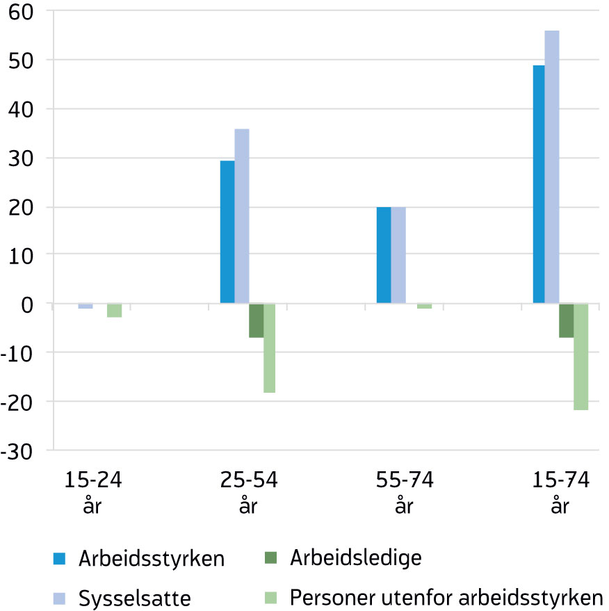 Sammenliknet med fjerde kvartal 2017 var det 49 000 flere personer i arbeidsstyrken i fjerde kvartal i fjor (figur 3). Sysselsettingen økte med 56 000 personer i den perioden og antall ledige gikk dermed ned med 7 000. Befolkningen i yrkesaktivalder økte med 27 000. Dette innebærer at antall personer utenfor arbeidsstyrken falt med 22 000. Det er særlig blant de mellom 25 og 54 år at antall personer utenfor arbeidsstyrken har falt. Befolkningen mellom 15 og 24 år falt med 3 000 personer fra fjerde kvartal 2017 til fjerde kvartal 2018. I samme periode var det nesten ingen endring i antall sysselsatte og arbeidsledige i aldersgruppen. Antall sysselsatte økte mest blant dem mellom 25 og 54 år, og det er denne aldergruppen som hadde nedgang i antall arbeidsledige.