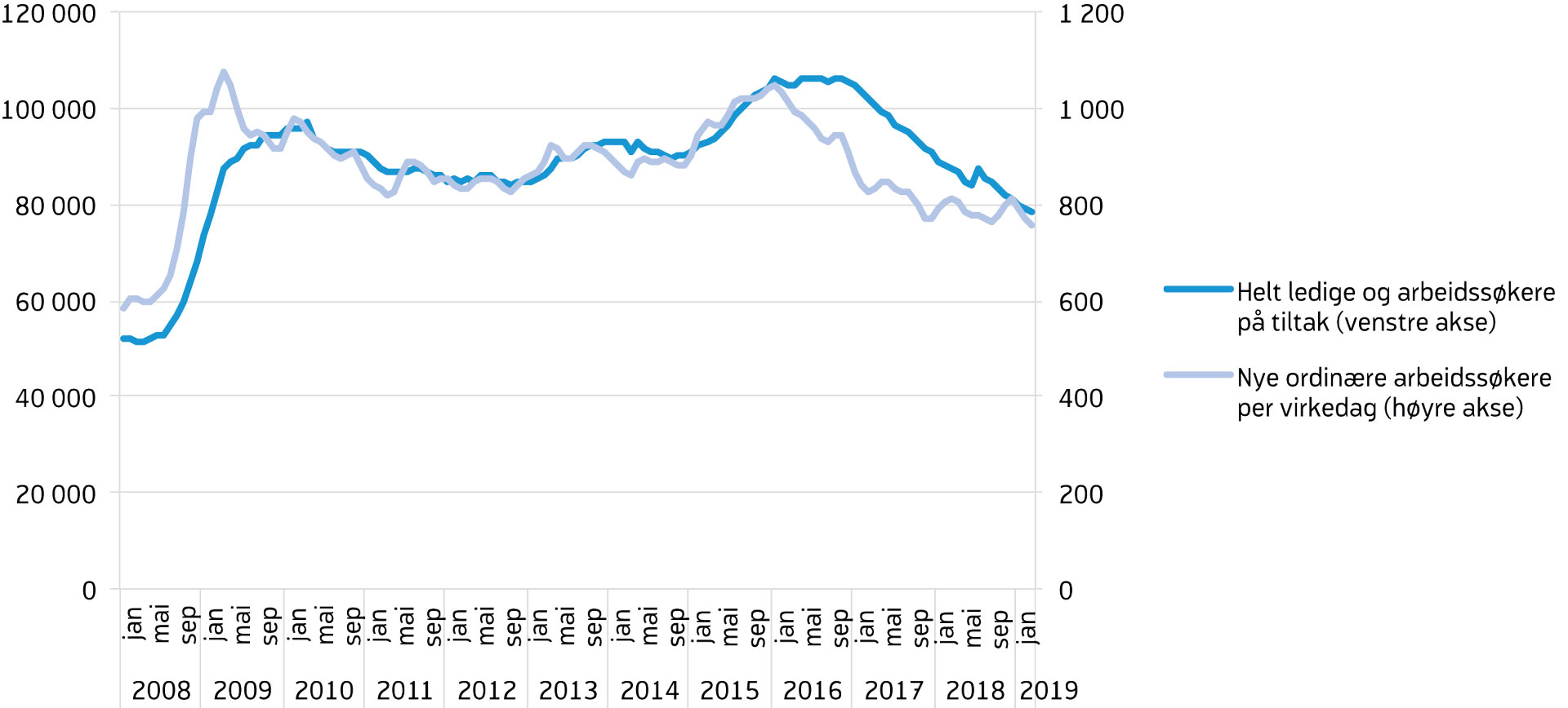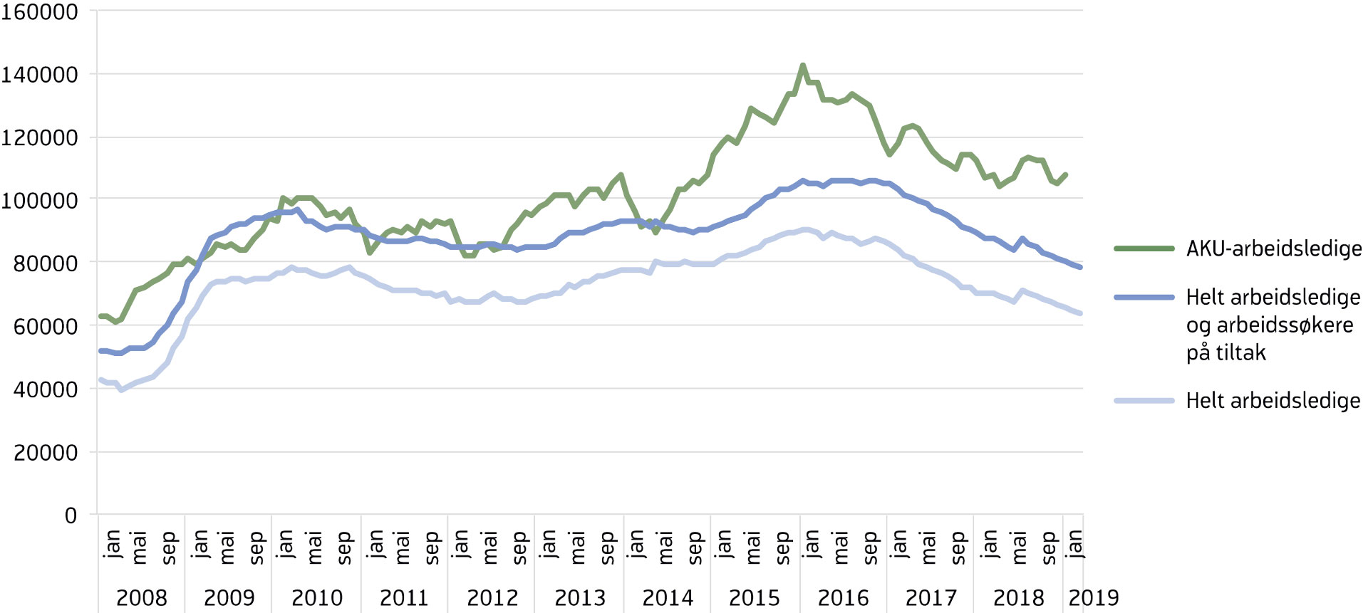 Under den forrige nedgangskonjunkturen økte arbeidsledigheten målt med AKU tidligere og betydelig mer enn den registrerte ledigheten, og det oppsto et uvanlig stort avvik mellom de to målene (se faktaboks «To mål på arbeidsledigheten i Norge»). Det at AKU-ledigheten fanger opp grupper som i liten grad melder seg til NAV, som studenter og nyutdannede på vei inn i arbeidslivet, kan forklare mye av avviket. I tillegg fortsatte antall personer i arbeidsstyrken å øke i løpet av 2015. Dette er uvanlig sammenliknet med tidligere nedgangskonjunkturer, der man har sett at yrkesdeltakelsen går ned når ledigheten er økende. Samtidig er noe av størrelsen på avviket trolig utslag av tilfeldigheter fordi AKU er en utvalgsundersøkelse. I januar 2016 nådde arbeidsledigheten målt med AKU toppen på 5,1 prosent av arbeidsstyrken, og den viste en betydelig nedgang i de påfølgende to årene. Siden i fjor vår har AKU-arbeidsledigheten vekslet mellom oppgang og nedgang, men de siste månedene har trenden vært stabil. I januar i år var arbeidsledigheten på 3,9 prosent av arbeidsstyrken, ifølge sesongjusterte tall. Avviket mellom AKU-ledigheten og den registrerte ledigheten har blitt noe mindre siden januar 2016, men er fortsatt stort historisk sett.