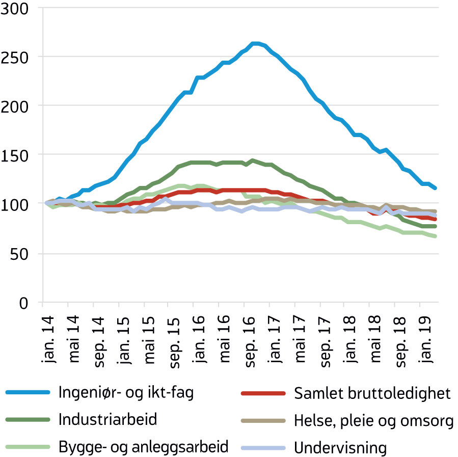Den siste oljedrevne nedgangskonjunkturen medførte en stor økning i ledigheten blant ingeniører (figur 8). Fra januar 2014 til november 2016 økte bruttoledigheten innen yrkesgruppen ingeniør- og ikt-fag med 164 prosent, og det var særlig for ingeniører og sivilingeniører innen oljerelaterte fag at ledigheten økte mest. Siden desember 2016 har bruttoledigheten innen ingeniør- og ikt-fag gått ned. Ved utgangen av mars var det registrert 32 prosent færre helt ledige eller arbeidssøkere på tiltak med denne yrkesbakgrunnen enn i mars i fjor, ifølge bruddjusterte tall. Ingeniør- og ikt-fag er dermed yrkesgruppen som har hatt størst nedgang i bruttoledigheten det siste året. Som andel av arbeidsstyrken var bruttoledigheten blant ingeniører på 1,6 prosent i mars, lavere enn landets gjennomsnitt på 3,0 prosent.