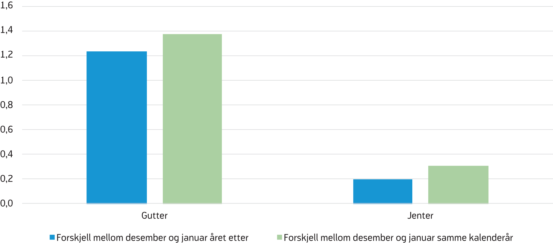 Å sammenligne barn født i desember med barn født i januar året etter gir en litt svakere effekt av fødselsmåned. Blant gutter er det 1,37 prosentpoeng flere mottakere av hjelpestønad i desember enn blant gutter født i januar samme kalenderår. Når vi sammenligner guttene født i desember med de som er født i januar året etter, reduseres differansen til 1,23 prosentpoeng. Også blant jenter ser vi at forskjellen i andelen med hjelpestønad mellom de født i januar og desember blir noe mindre når vi sammenligner med januar året etter. Samlet sett kan vi likevel si at barn i alderen 6-17 år som er født sent på året har betydelig større sannsynlighet for å motta hjelpestønad enn barn i samme alder født tidlig på året, spesielt blant gutter.