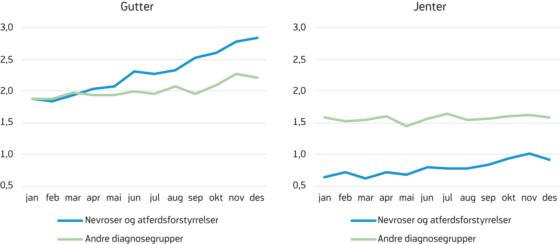 Stoltenbergutvalget leverte nylig sin rapport om kjønnsforskjeller i skolepresentasjoner og utdanningsløp (NOU 2019:3). I denne rapporten blir ulik modningstakt for gutter og jenter trukket frem som en viktig forklaring på kjønnsforskjeller i skoleprestasjoner. De gjengir forskning som blant annet viser at jenter både har en tidligere utvikling av kognitive ferdigheter enn gutter, samt mer utviklede sosiale og emosjonelle ferdigheter. Dette kan for eksempel ha betydning for hvilke kunnskaper barna tilegner seg før og etter skolestart, samt påvirke deres evne til selvregulering av oppmerksomhet, aktivitet og impulser. Utvalget peker videre på at de som er eldst ved skolestart, altså de som er født tidlig på året, i snitt får bedre skoleresultater og at de i mindre grad blir ansett som hyperaktive. Det poengteres imidlertid at relativ alder[2]Relativ alder anslås ved å sammenlikne alderen til en person, for eksempel en elev i en skoleklasse, med alderen til de øvrige i samme gruppe. Relative alderseffekter (RAE) defineres dermed som de konsekvensene relativ alder har for hver enkelt person i gruppen. har like mye å si for gutter og jenters skoleprestasjoner tidlig i skoleløpet. Forskning om kjønnsforskjeller i psykisk helse trekkes også frem, blant annet at gutter i større grad enn jenter har såkalte eksternaliserende (utagerende) vansker og lidelser samt autismespekterdiagnoser. Slike eksternaliserende vansker synes å ha en negativ effekt på skoleprestasjonene (NOU 2019:3).