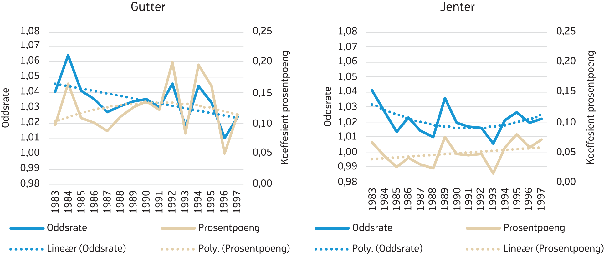 Andelen mottakere av hjelpestønad økte betydelig for begge kjønn fra 1983-kohorten og frem til 1995-kohorten (figur 1). For de som er født i 1995 eller senere ligger andelen mottakere totalt sett stabilt på rett over 7 prosent for hver kohort. Det er dermed en dobling i andelen mottakere når vi sammenlikner 1983-kohorten med 1997-kohorten. Forskjellen mellom gutter og jenter har også økt noe, fra en forskjell på 1,5 prosentpoeng blant de som er født i 1983 til 3,6 prosentpoeng for de født i 1995, som er kohorten med størst differanse. I 1995-kohorten er det 68 prosent flere mottakere av hjelpestønad blant gutter enn blant jenter.