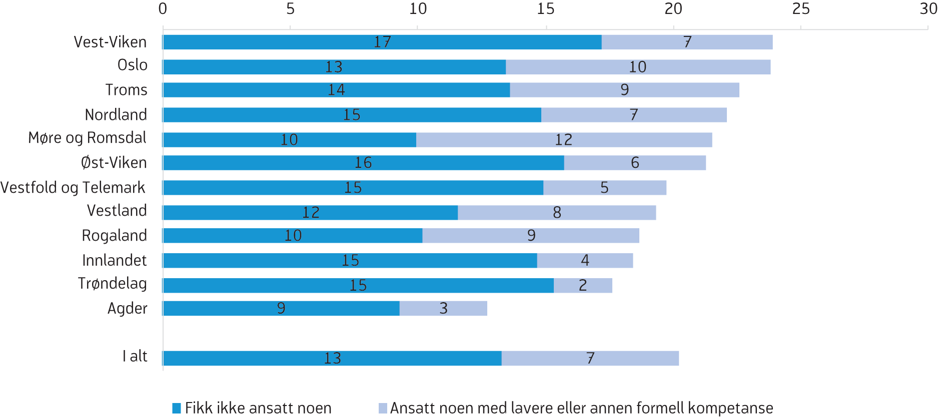 Figur 1. Virksomheter som har mislyktes i å rekruttere arbeidskraft eller har måttet ansette noen med annen eller lavere formell kompetanse enn man søkte etter, etter region/fylke. Prosent