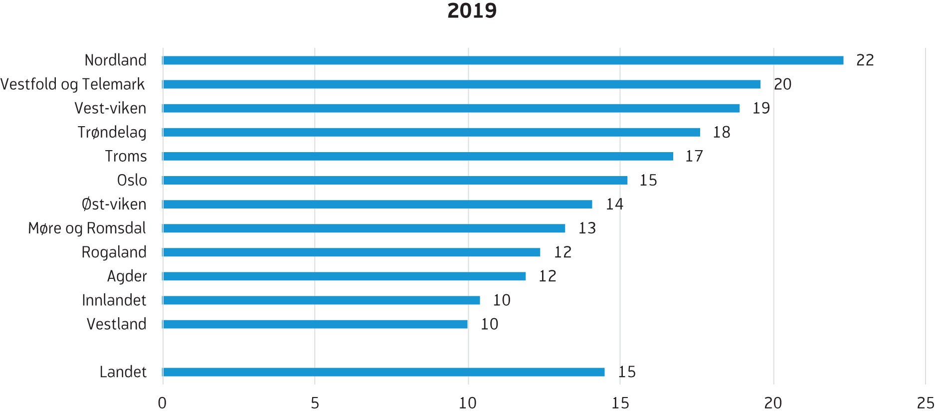 Målt i antall personer, er mangelen på arbeidskraft høyest i Oslo, med 9 650 personer (tabell 1). Målt ved stramhetsindikatoren er mangelen høyest i Nordland fulgt av Troms. Sammenliknet med for ett år siden har mangelen økt i alle fylker/regioner bortsett fra Trøndelag som har en liten nedgang. Rogaland har størst økning i mangel på arbeidskraft sammenliknet med i fjor, fra en mangel på 1 800 personer i 2018 til 4 600 personer i 2019.