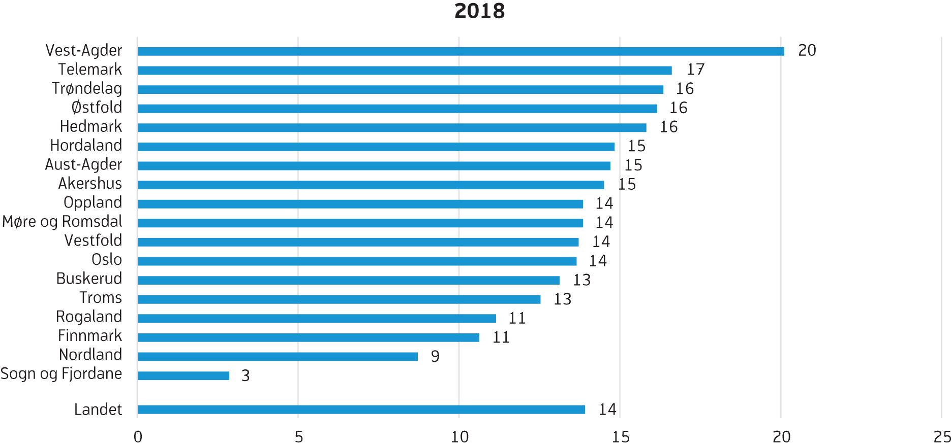 Årene 2014–2016 var preget av spesielt store regionale forskjeller på arbeidsmarkedet. Nedgangstider i oljebransjen rammet særlig bedriftene i Rogaland, men også andre steder på Sør- og Vestlandet. Disse forskjellene preger fortsatt arbeidsmarkedet i Norge, men ikke i like stor grad. I Vest-Viken, Oslo og Troms finner vi den høyeste andelen virksomheter som oppgir å ha hatt rekrutteringsvansker de siste tre månedene (figur 1). Rekrutteringsproblemene er minst i Agder, Trøndelag og Innlandet. For to år siden var det i Rogaland vi fant den laveste andelen virksomheter med rekrutteringsproblemer. Ledigheten har fortsatt å gå mye ned i fylket det siste året, og i år ligger Rogaland omtrent på landsgjennomsnittet når det gjelder rekrutteringsproblemer.