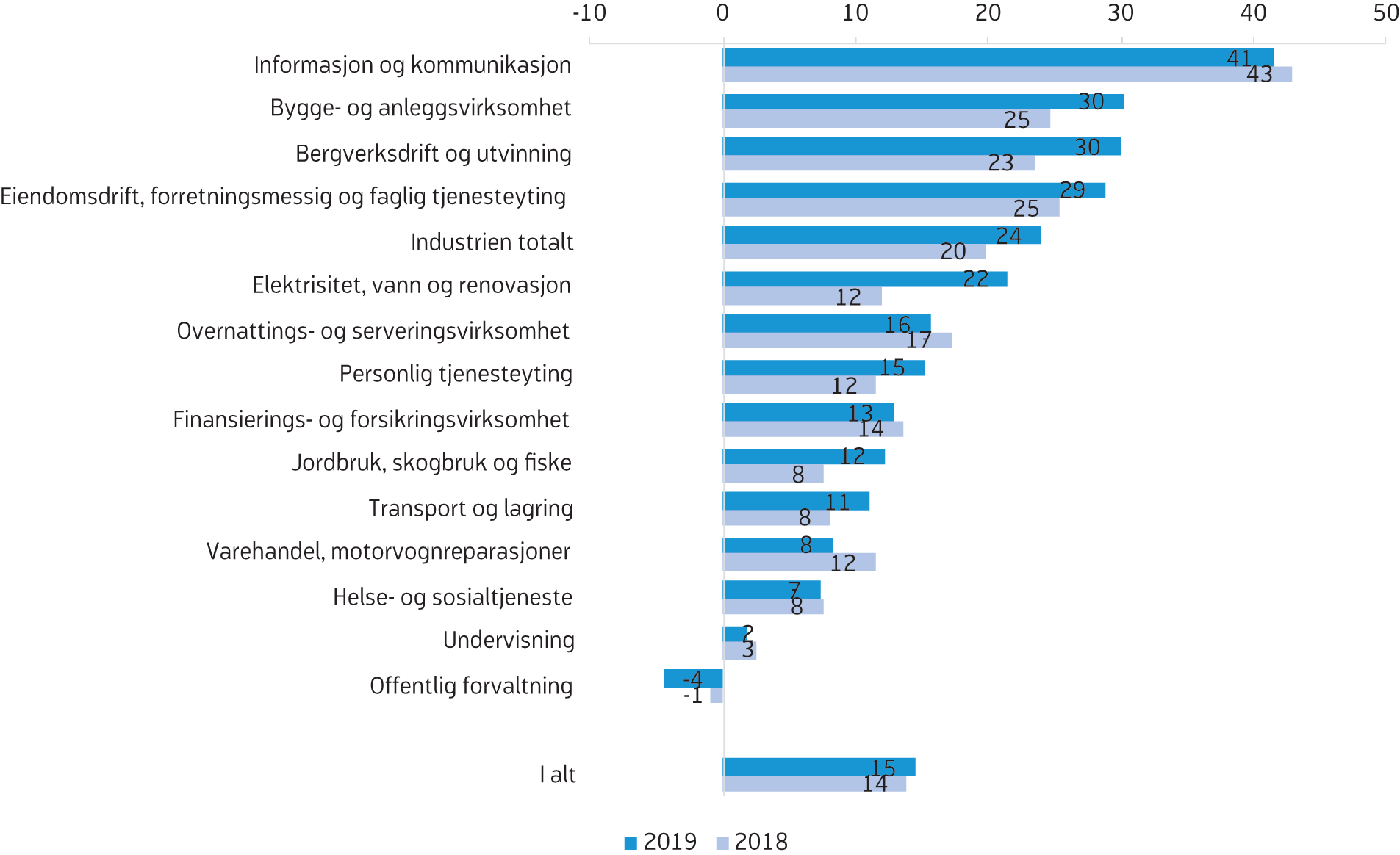 Virksomhetenes sysselsettingsforventninger er omtrent som i fjor og året før, men en del høyere enn i årene 2014–2016. Det er imidlertid forskjeller mellom ulike fylker og næringer. Bedriftene i Nordland og Vestfold og Telemark er de mest optimistiske, mens bedriftene i Vestland og Innlandet relativt sett er mindre optimistiske. Det ventes imidlertid sysselsettingsvekst innen samtlige fylker i 2019. Informasjon og kommunikasjon, er som i fjor, næringen med høyest nettoandel bedrifter som venter sysselsettingsvekst det kommende året.