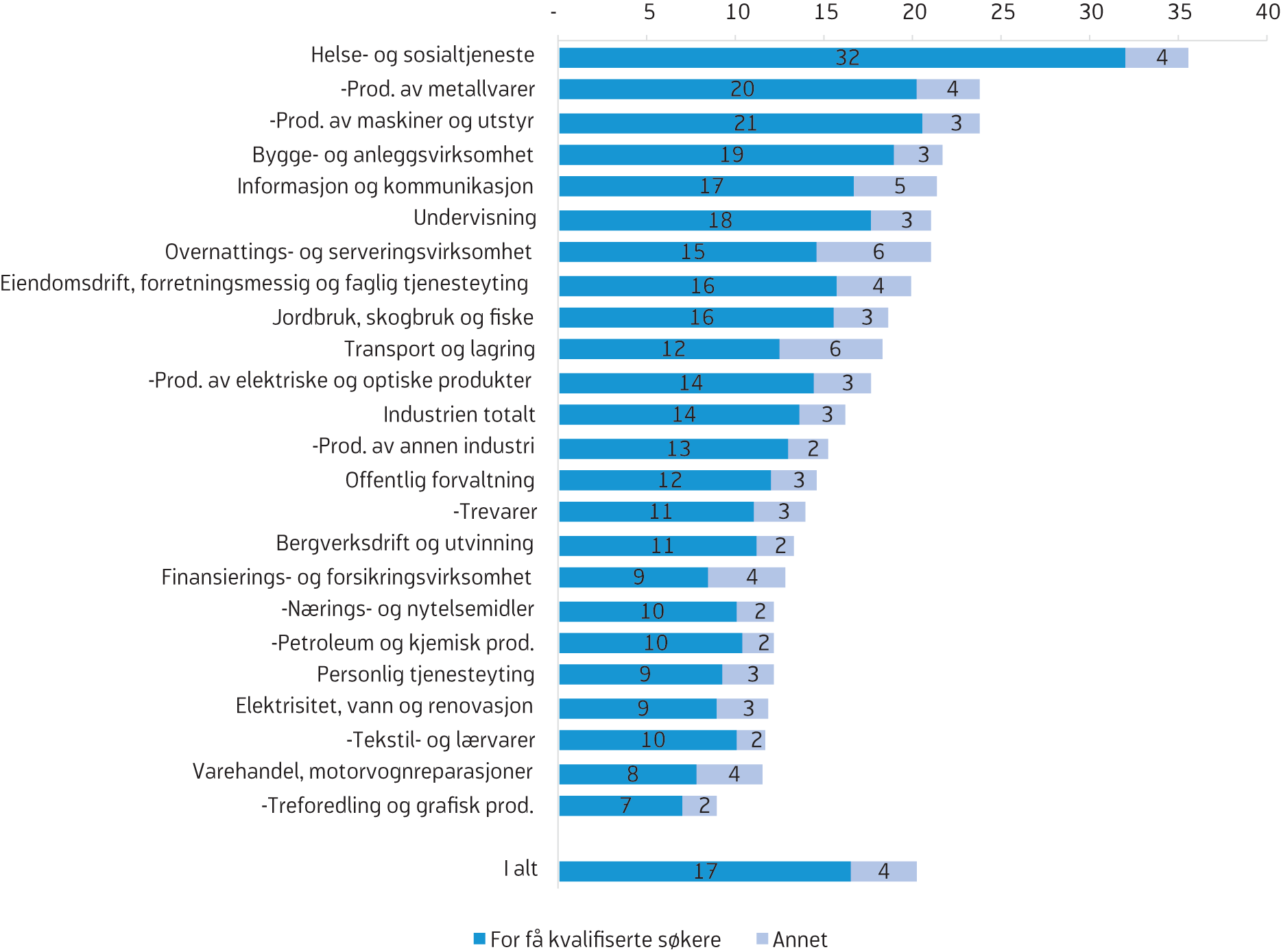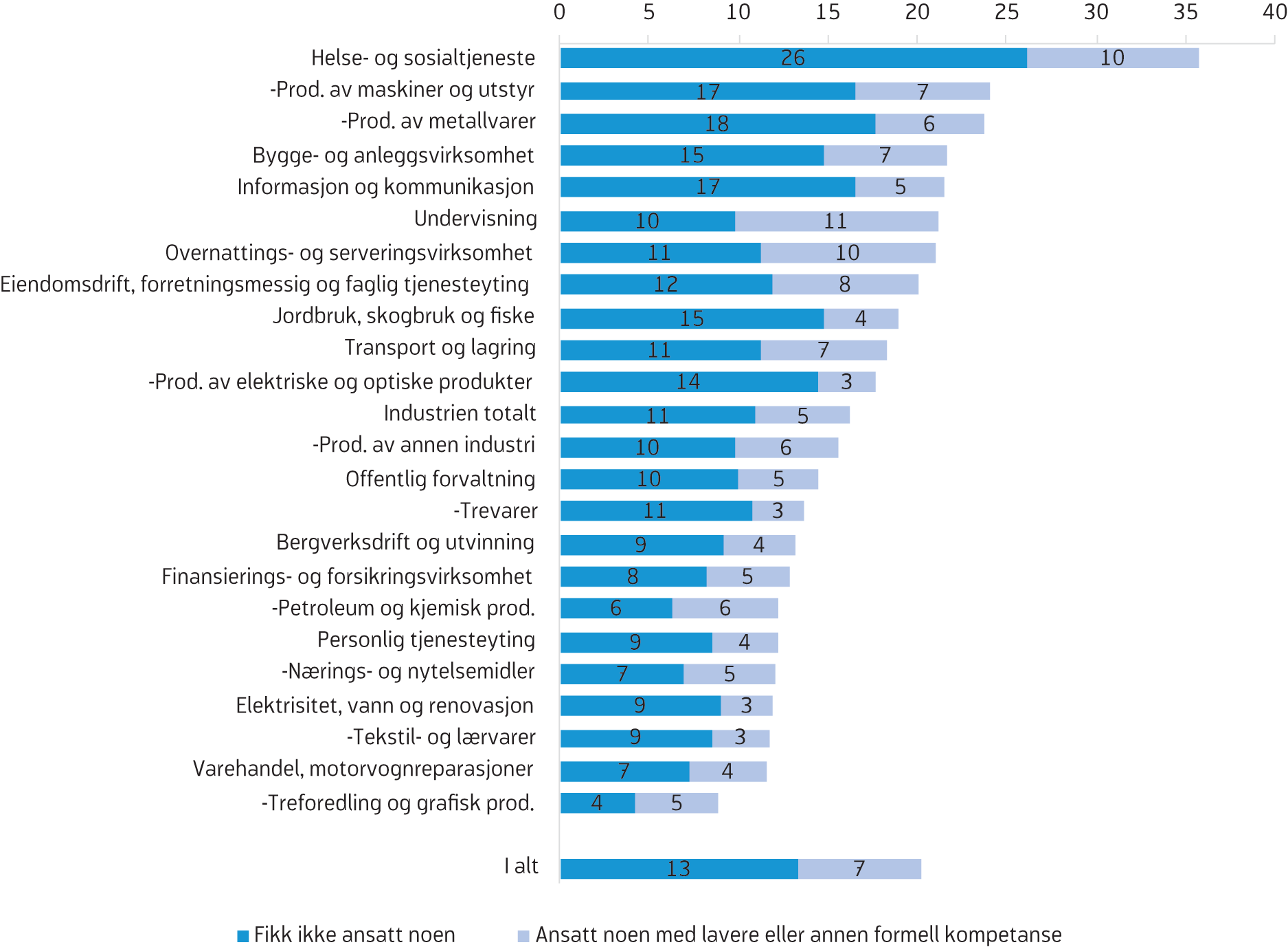 I alt svarte 20 prosent av virksomhetene at de har hatt problemer med å få tak i rett kompetanse (figur 1). Dette er en noe høyere andel enn i fjor og året før[2] Vi har endret litt på spørsmålsformuleringen på dette spørsmålet fra i fjor, så resultatene er ikke nødvendigvis helt sammenliknbare. I fjor var spørsmålsformuleringen som følger: Har bedriften mislyktes i å rekruttere arbeidskraft de siste tre månedene? I år er spørsmålet stilt på følgende måte: Har bedriften de siste tre månedene forsøkt å rekruttere inn personer uten å få tak i rett/ønsket kompetanse?. 13 prosent oppgir at de ikke fikk ansatt noen, mens 7 prosent oppgir at de ansatte noen med lavere eller annen formell kompetanse. Virksomhetene med rekrutteringsproblemer blir bedt om å oppgi om rekrutteringsproblemene skyldes for få kvalifiserte søkere på stillingen(e), eller om det skyldtes andre årsaker. 17 prosent av bedriftene oppga at de hadde rekrutteringsproblemer på grunn av for få kvalifiserte søkere, mens 4 prosent oppga at det skyltes andre årsaker (figur 2).