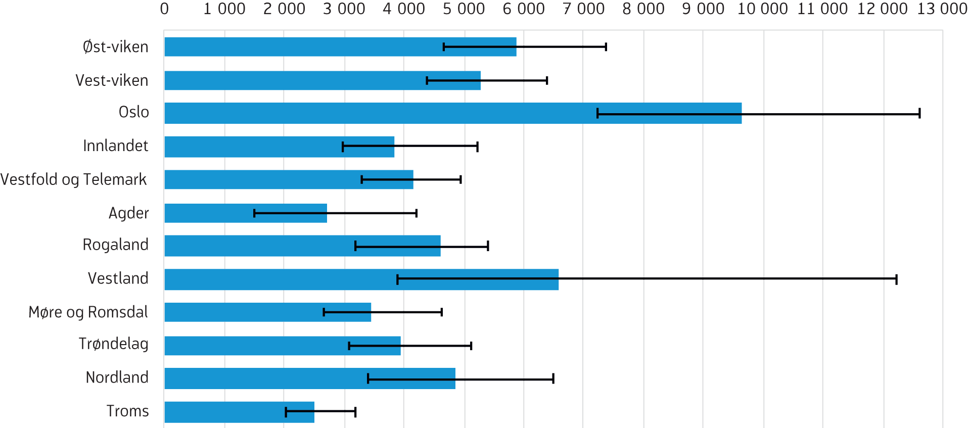 Figur 9: Estimert mangel på arbeidskraft med konfidensintervaller. Etter fylke/region