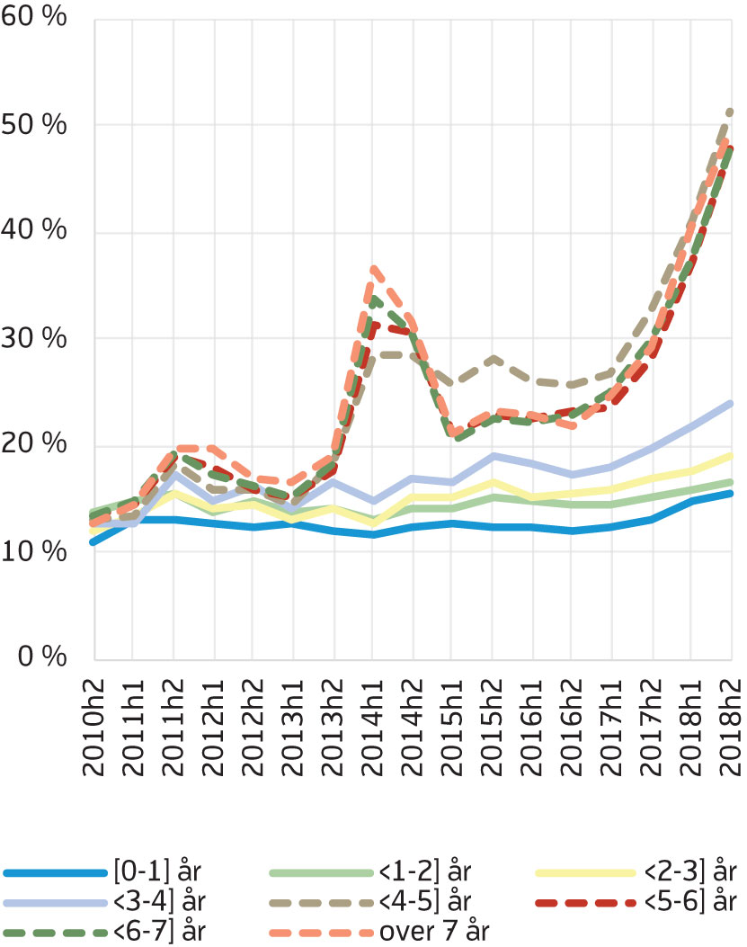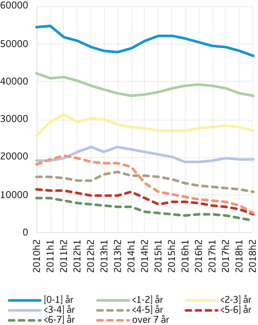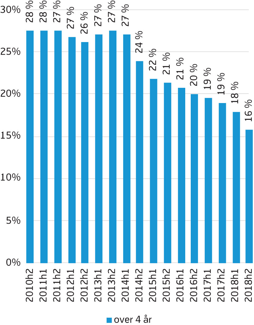 Det er flest mottakere med kort varighet, og færre med lang varighet (stiplede linjer i figur 1). Antall med varighet på mer enn fire år utgjør en stadig mindre andel av AAP-mottakerne (figur 2). Det var en kraftig reduksjon i andel med varighet på over fire år i 2014, og et nytt markert fall i 2018, der bare 16 prosent av mottakerne har en varighet utover fire år i andre halvår.