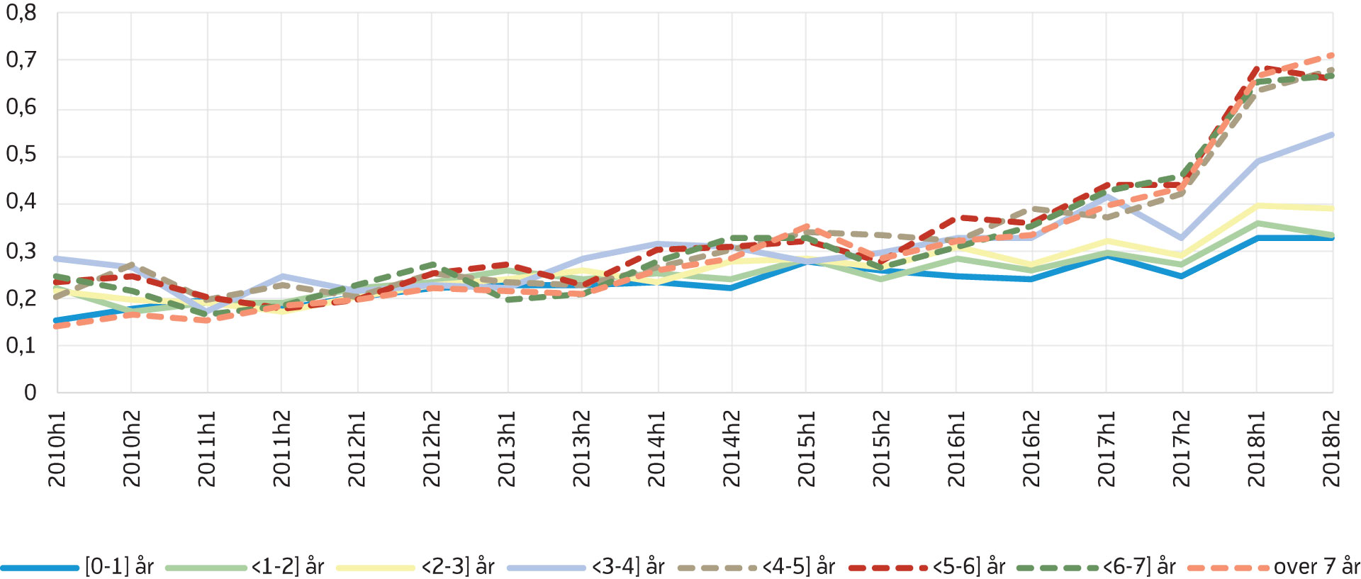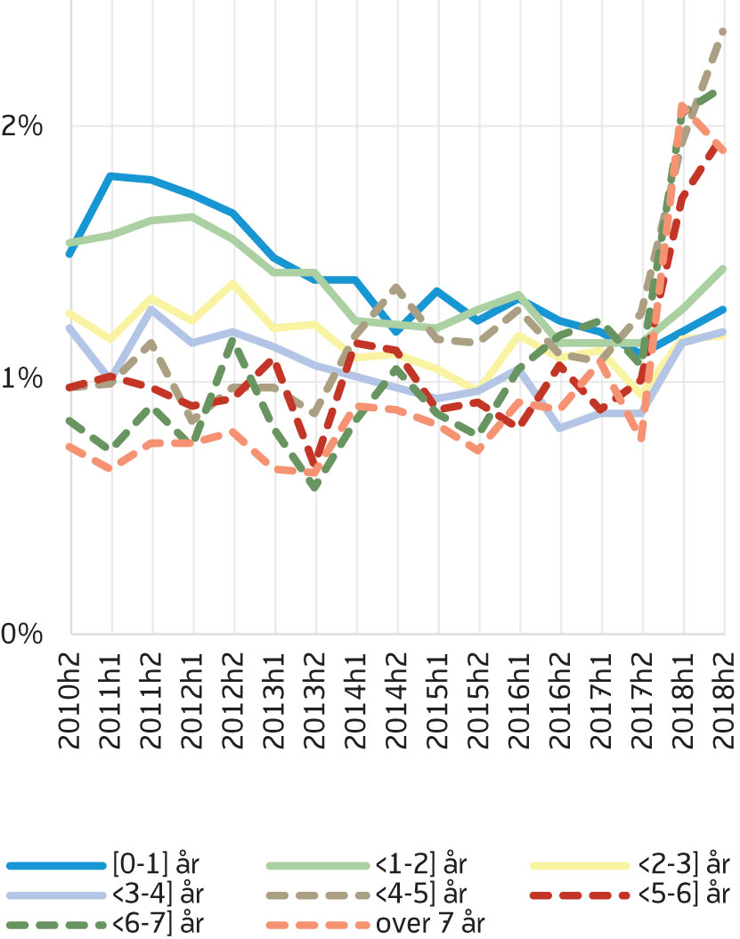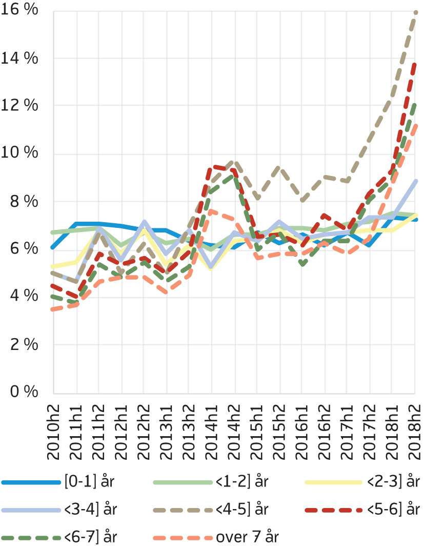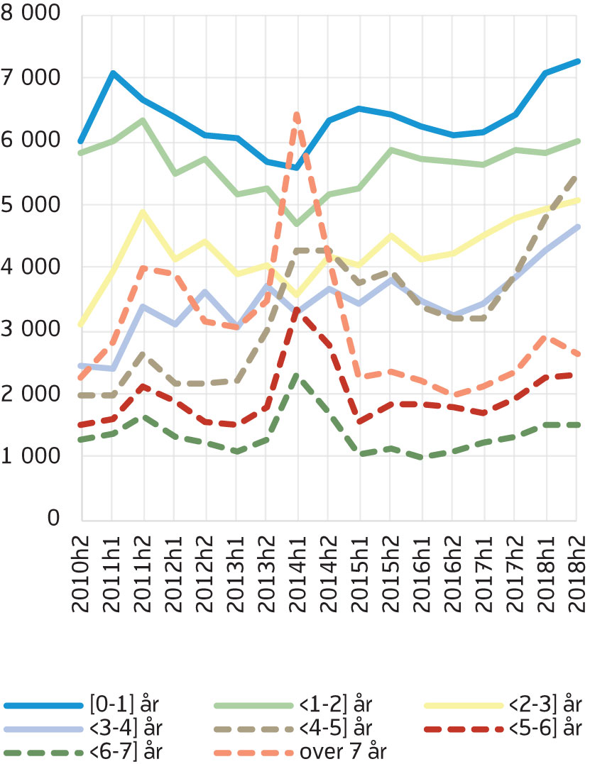 Figur 5 viser antall personer i hver varighetsgruppe som avslutter hvert halvår fra juli 2010 til desember 2018 (figur 5). Det er mange som slutter å motta AAP lenge før den maksimale perioden på fire (nå tre) år løper ut. Av de syv varighetsgruppene er det flest som slutter etter 0–1 år som AAP-mottaker. Antall som avslutter AAP innen det har gått ett år har ligget mellom 6000 og 8000 i perioden vi ser på, og utgjør cirka en fjerdedel av de som avslutter. Det er sterk vekst i sannsynlighet for å avslutte AAP i alle varighetsgrupper fra andre halvår 2017, og for de fleste gruppene fortsetter dette ut 2018 (figur 6). Sannsynligheten for å avslutte AAP er lavest blant de som har mottatt AAP i 0–1 år, mens økningen er størst for de med lang varighet. I perioden 2015–2016 var for eksempel sannsynligheten for å avslutte AAP 26–28 prosent dersom du hadde mottatt AAP i 4–5 år. Denne økte til 51 prosent i andre halvår 2018 (figur 6). Også i gruppene med kortere varighet var økningen stor, selv om det ikke er like tydelig i figuren fordi økningen kommer fra et lavere nivå. For eksempel lå sannsynligheten for å avslutte AAP dersom man har mottatt ytelsen i ett år eller kortere på 12 prosent, inntil den økte til 16 prosent i andre halvår 2018.