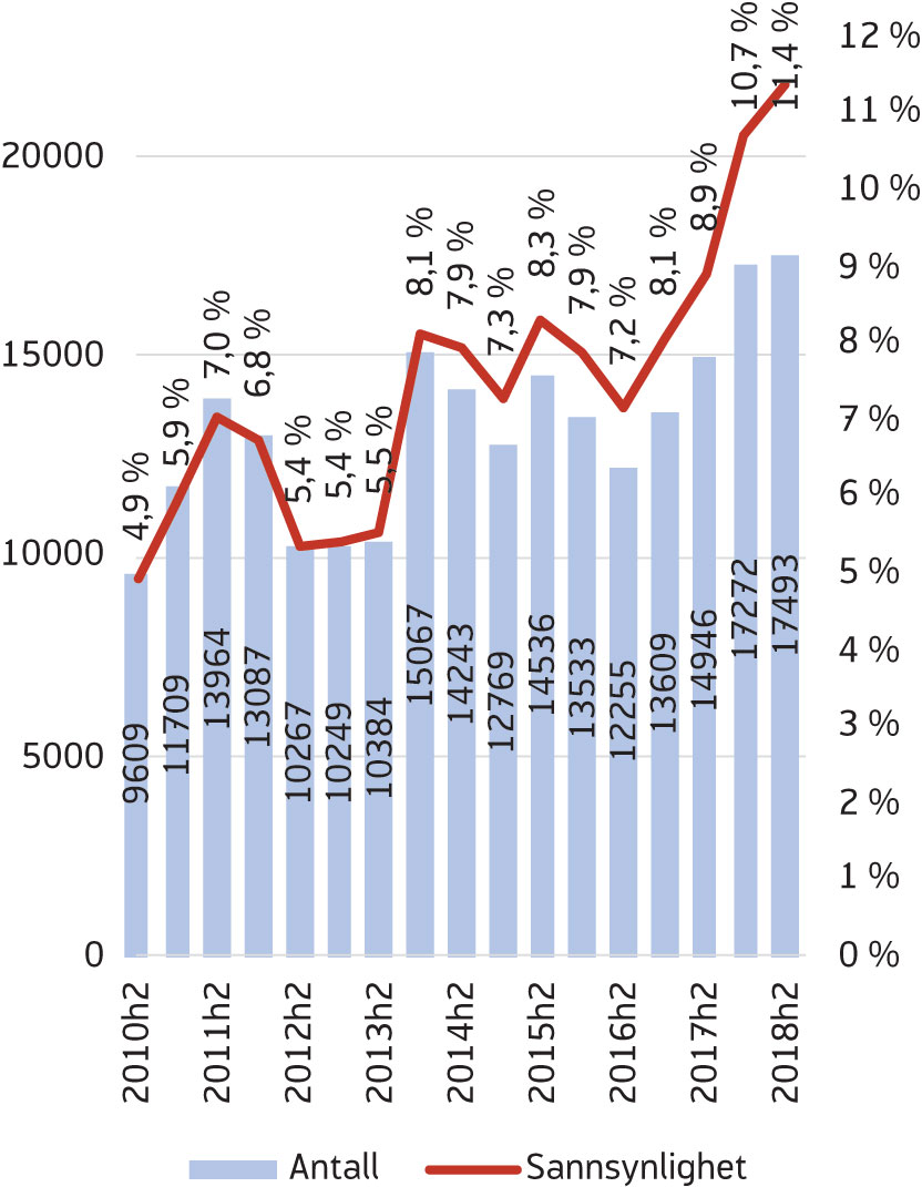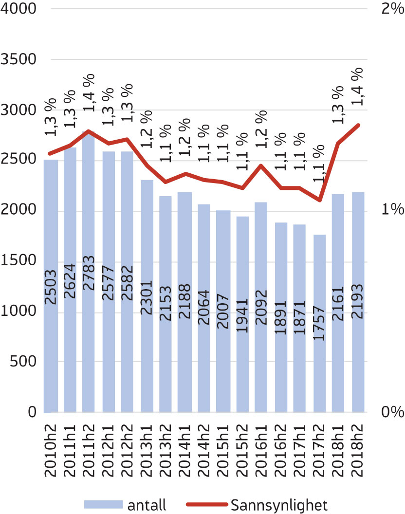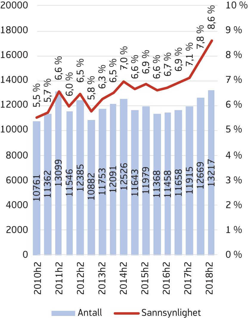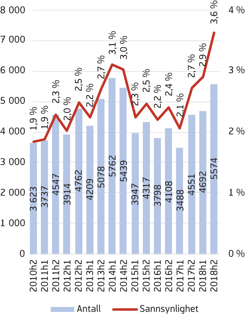 Vi forventet at antall som mottok AAP seks måneder etter at de hadde avsluttet AAP ville gå kraftig ned. Vi finner imidlertid en markant, men liten, økning i 2018 (figur 13). Blant de som avslutter første og andre halvår 2018 er det hvert halvår om lag 2 200 som avslutter til AAP. Dette er en liten økning sammenliknet med perioden 2015–2016, da antallet varierte mellom 1900 og 2 100. Totalt for 2018 ser det ut til å ha vært en økning på 400 personer sammenliknet med det årlige gjennomsnittet for perioden 2015–2016. Sannsynligheten for å avslutte til AAP har også økt noe i løpet av samme periode, fra å ligge på 1,1–1,2 prosent til 1,3–1,4 prosent (figur 13). I gjennomsnitt tilsvarer dette en økning på 0,2 prosentpoeng.