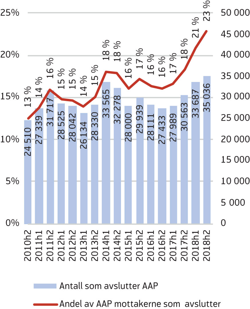 Antall mottakere av AAP har falt fra 2011 til i dag (figur 3). I hovedsak skyldes nedgangen i antall mottakere at antall som avslutter har økt samtidig som antall som kommer inn er stabilt (NAV 2019). Innskjerpingen av regelverket med hensyn til hvem som har rett til AAP, har også ført til at cirka 1600 færre fikk innvilget AAP i 2018 (se Lande 2019). Men dette har mindre betydning for nedgangen i antall mottakere enn økt avgang. Samtidig som antall mottakere stadig synker, øker antall som avslutter AAP kraftig i 2018 (figur 3 og 4). Dette medfører at sannsynligheten for å avslutte AAP har økt fra 16–17 prosent i perioden 2015–2016 til henholdsvis 21 og 23 prosent i første og andre halvår 2018 (figur 4). Økningen begynte allerede fra andre halvår 2017. En mulig forklaring på at økningen skjedde allerede siste halvår 2017 kan være at det har skjedd en tilpasning i saksbehandlingen allerede før nytt regelverk trådte i kraft, og at andre halvår 2017 derfor kan betraktes som en overgangsperiode mellom gammelt og nytt regelverk.