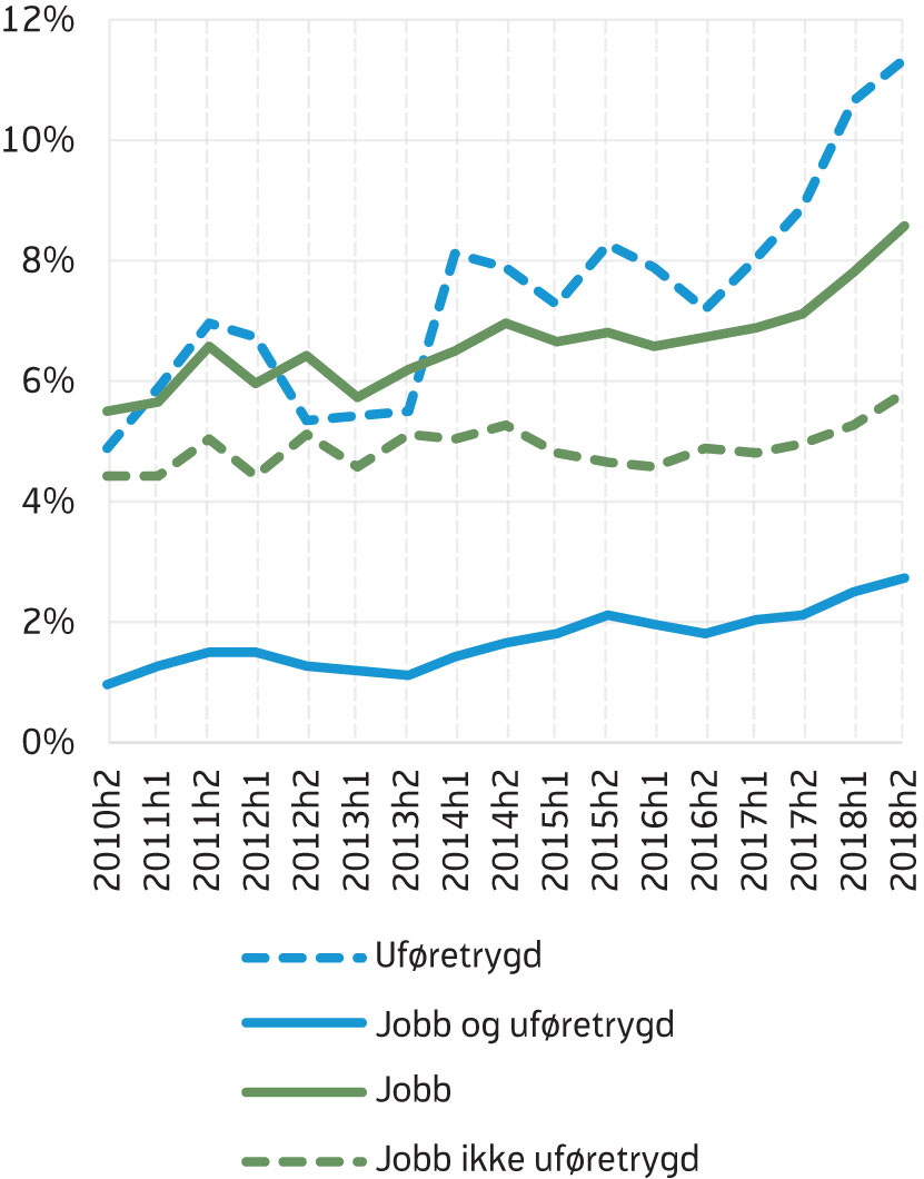 Sannsynligheten for å være i jobb (ikke ufør) har aldri tidligere vært så høy som i andre halvår 2018 (5,8 %). Konjunkturene har vært i bedring siden 2016, og dette påvirker hvor mange som er i jobb etter avsluttet AAP. For gruppen «jobb ikke uføretrygd» (figur 7), er det en tydelig korrelasjon med konjunkturutviklingen, med nedgang i 2015 og bedring i arbeidsmarkedet utover i 2016.