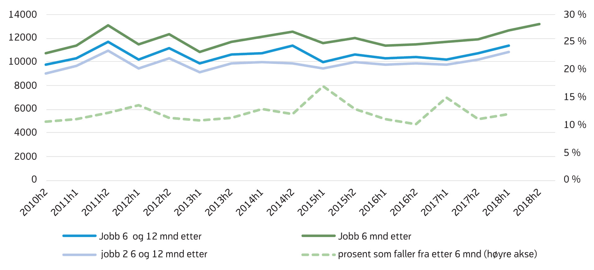 Antall og sannsynligheten for å avslutte AAP til jobb er høyere enn noen gang siden innføringen av AAP (figur 11). Av de som avsluttet AAP til jobb i løpet av første og andre halvår 2018, er henholdsvis 12 700 og 13 200 i jobb seks måneder senere. Dette er en liten økning sammenliknet med perioden 2015–2016, da antallet varierte mellom 11 400 og 12 000. Totalt for 2018 har det altså vært en økning på 2 600 personer sammenliknet med det årlige gjennomsnittet for perioden 2015–2016. Sannsynlighet for å avslutte til jobb lå på 7,8 i første halvår 2018 og 8,6 prosent andre halvår 2018 (figur 11). Sammenliknet med perioden 2015–2016, da sannsynligheten varierte mellom 6,6 og 6,9 prosent, er dette en økning på 1,5 prosentpoeng.