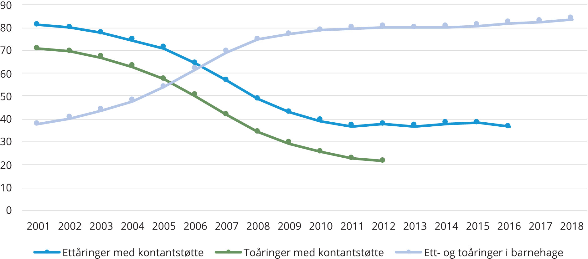 I 2001 var andelen ettåringer som mottok kontantstøtte 81,1 prosent, mens 36,5 prosent mottok kontantstøtte i 2016. Nedgangen skyldes i hovedsak økt barnehagedekning for ett- og toåringer. Tall fra SSB viser at barnehagedekningen har økt fra 62 prosent i 2000 til å holde seg stabilt over 90 prosent i de senere årene, hvor det i stor grad er blant de yngste barna at økningen har funnet sted (Statistisk Sentralbyrå 2017).