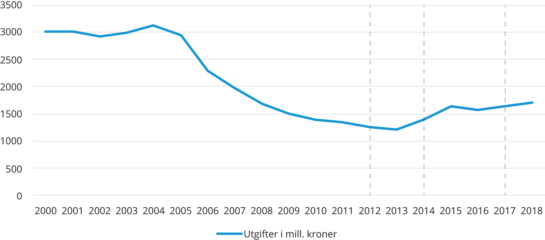 Figur 2. Utgifter til kontantstøtte. Millioner kroner.