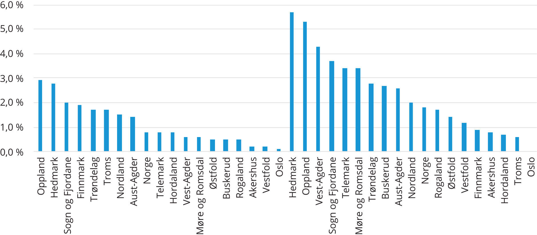 Figur 4. Andel med henholdsvis 40 pst. og 20 pst. Kontantstøtte1 per juni 2019, etter fylke. Prosent.