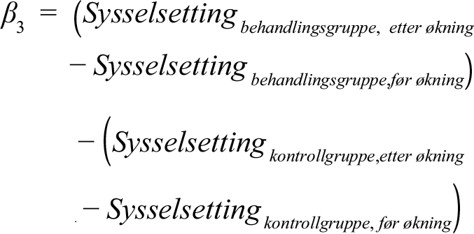 Metoden vi benytter er differanser-i-differanser (difference-in-difference), som er en statistisk modell som sammenligner forskjellen mellom to grupper over to tidsperioder. Den første differansen måler forskjellen mellom behandlingsgruppen og kontrollgruppen, mens den andre differansen måler forskjellen over tid. Sistnevnte kontrollerer for effekter som skyldes konjunktursvingninger og andre forhold som kan endre seg i løpet av analyseperioden. En kritisk forutsetning er imidlertid at behandlingsgruppen og kontrollgruppen ville hatt lik utvikling dersom ingen av gruppene ble påvirket av satsendringen. Modellen kan uttrykkes på følgende måte: