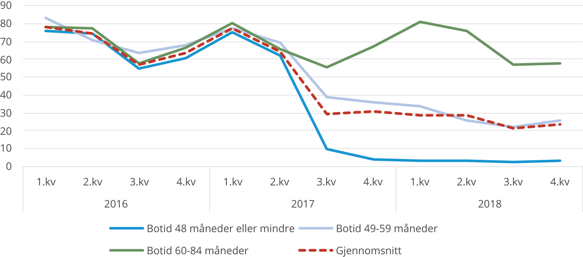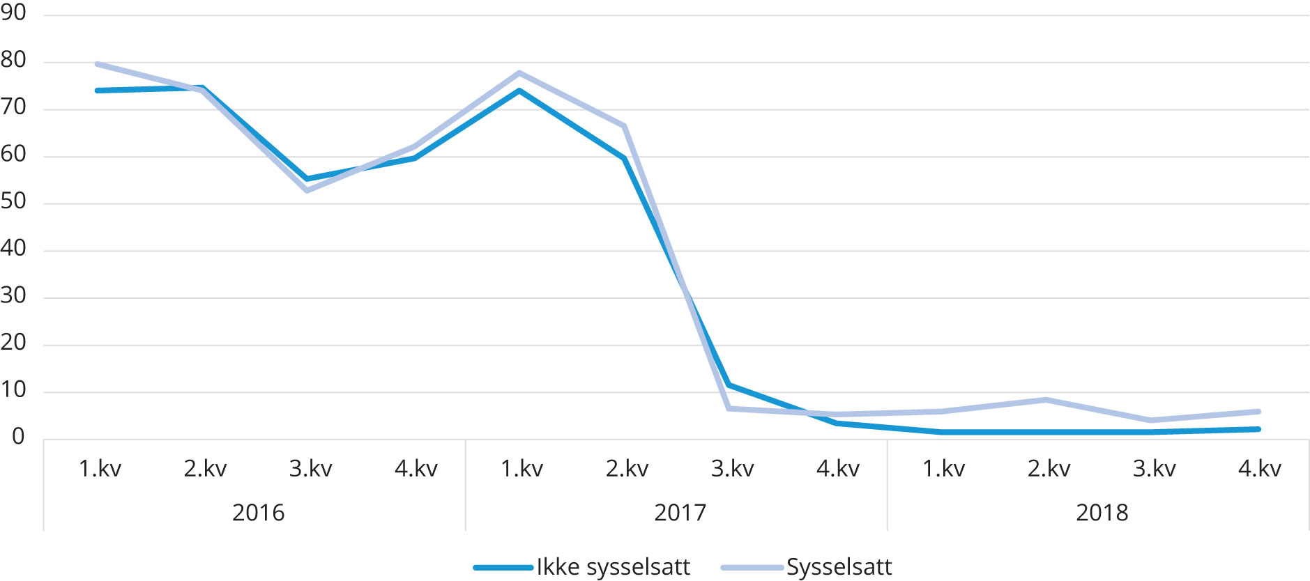 Regelverksendringen ble innført for hele gruppen på samme tid, og det byr på utfordringer når vi skal forsøke å måle effekten av endringen. For å undersøke om lovendringen påvirker sysselsettingen til innvandrerkvinner med barn i kontantstøttealder benytter vi en analyse av andelen som er i jobb i kontantstøtteperioden etter regelverksendringen sammenlignet med før regelverksendringen. Vi deler først gruppen inn i tre, de som har botid på 4 år eller mindre (48 måneder eller mindre), de med botid på 49–59 måneder (oppfyller botidskravet underveis i kontantstøtteperioden), og kontrollgruppen som er de som har botid på 5–7 år (60–84 måneder). Vi benytter gjentatte tverrsnittsdata. Et mulig problem med å bruke slike data i en før- og etter analyse er at sammensetningen av gruppene kan endre seg over tid. Tidligere analyser har vist at det kan være store forskjeller i sysselsetting mellom innvandrere fra ulike land utenfor EU/EØS. Hvis det i perioden for eksempel er blitt flere kvinner med en landbakgrunn som tenderer mot høy sysselsetting, kan sysselsettingen til gruppen i kontantstøtteperioden øke over tid fordi gruppesammensetningen har endret seg. En annen mulig trussel mot en kausal tolkning av vår analyse er at sysselsettingen kan påvirkes av økonomiske konjunkturer. Mot slutten av 2014 begynte arbeidsledigheten å øke betydelig på grunn av kraftig fall i oljeprisen. Ledigheten nådde en topp mot slutten av 2015 og starten av 2016, for deretter å falle igjen i 2017 og 2018 (Vidal-Gil 2019). I perioden etter at botidskravet ble innført har det dermed blitt lavere registrert ledighet, og i vår analyse kan det innebære at sysselsettingen øker på grunn av lavere ledighet, og ikke på grunn av botidskravet.